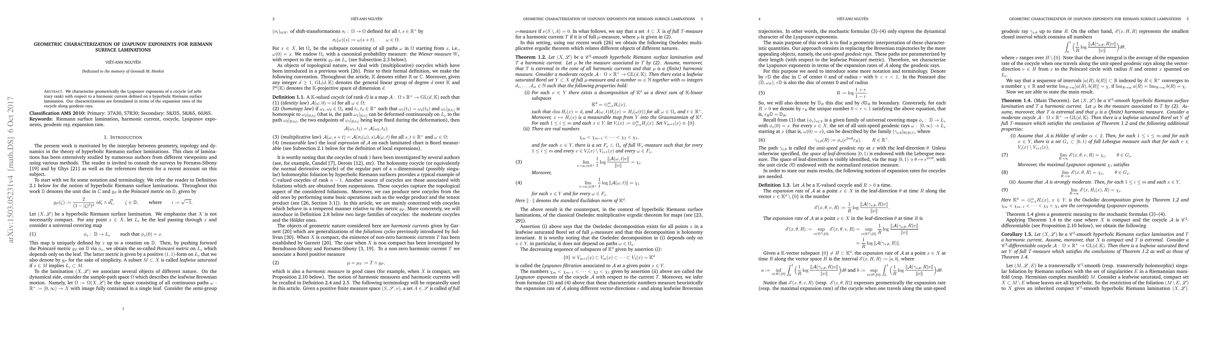 We characterize geometrically the Lyapunov exponents of a cocycle (of arbitrary rank) with respect to a harmonic current defined on a hyperbolic Riemann surface lamination. Our characterizations are formulated in terms of the expansion rates of the cocycle along geodesic rays.