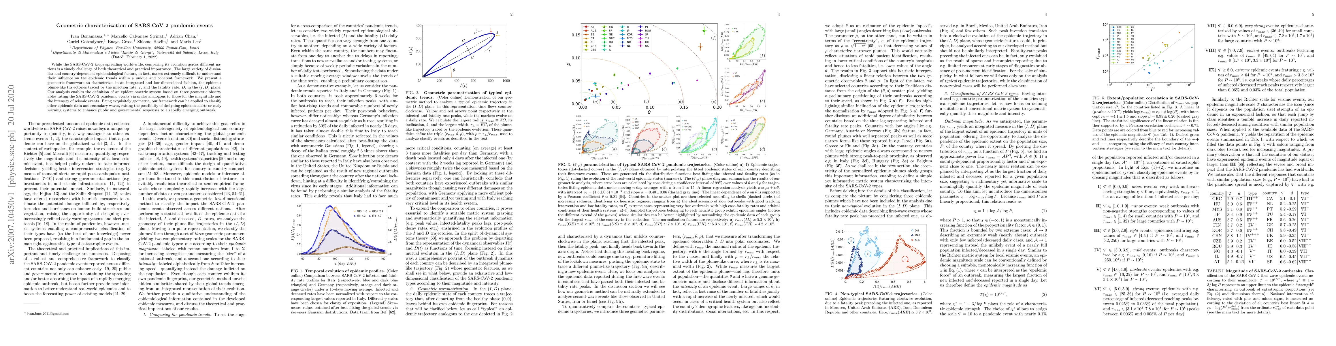 While the SARS-CoV-2 keeps spreading world-wide, comparing its evolution across different nations is a timely challenge of both theoretical and practical importance. The large variety of dissimilar and country-dependent epidemiological factors, in fact, makes extremely difficult to understand their influence on the epidemic trends within a unique and coherent framework. We present a geometric framework to characterize, in an integrated and low-dimensional fashion, the epidemic plume-like trajectories traced by the infection rate, $I$, and the fatality rate, $D$, in the $(I,D)$ plane. Our analysis enables the definition of an epidemiometric system based on three geometric observables rating the SARS-CoV-2 pandemic events via scales analogous to those for the magnitude and the intensity of seismic events. Being exquisitely geometric, our framework can be applied to classify other epidemic data and secondary waves, raising the possibility of designing epidemic alerts or early warning systems to enhance public and governmental responses to a rapidly emerging outbreak.