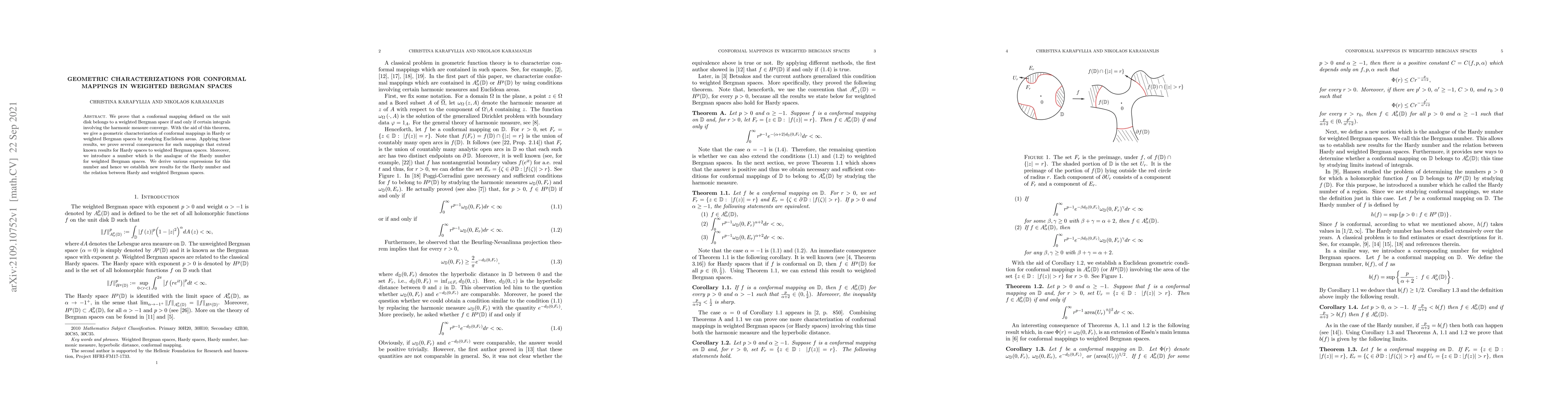 This paper proves that conformal mappings on the unit disk belong to weighted Bergman spaces if specific integral conditions involving harmonic measure are met. It provides geometric characterizations of such mappings by examining Euclidean areas and extends known results from Hardy to weighted Bergman spaces, introducing a new analogue of the Hardy number.
