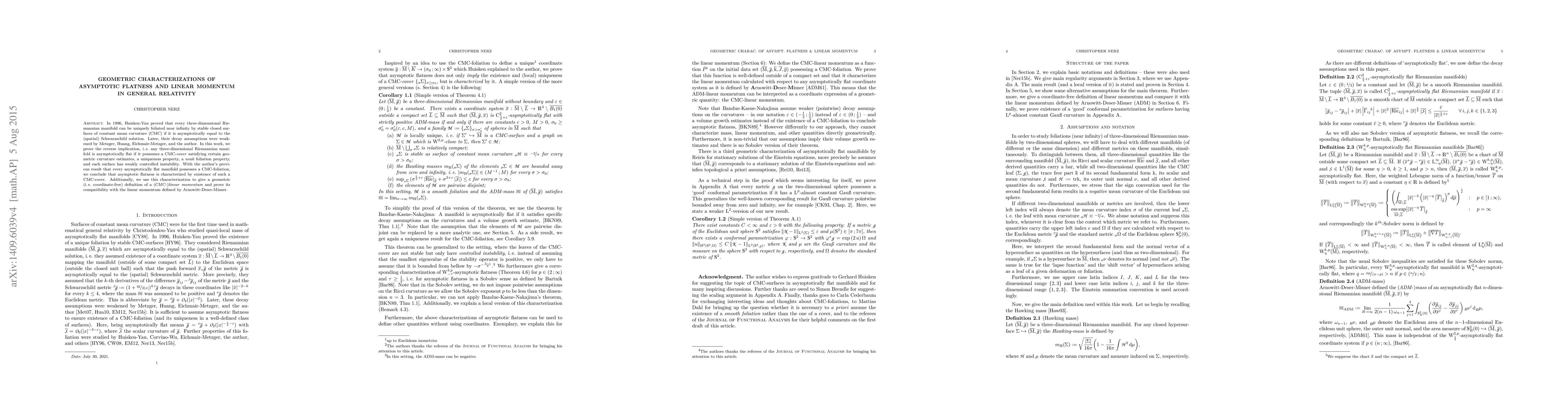 This paper proves that asymptotic flatness in general relativity is characterized by the existence of a CMC-cover under certain geometric conditions. It also introduces a coordinate-free definition of linear momentum compatible with the Arnowitt-Deser-Misner definition.