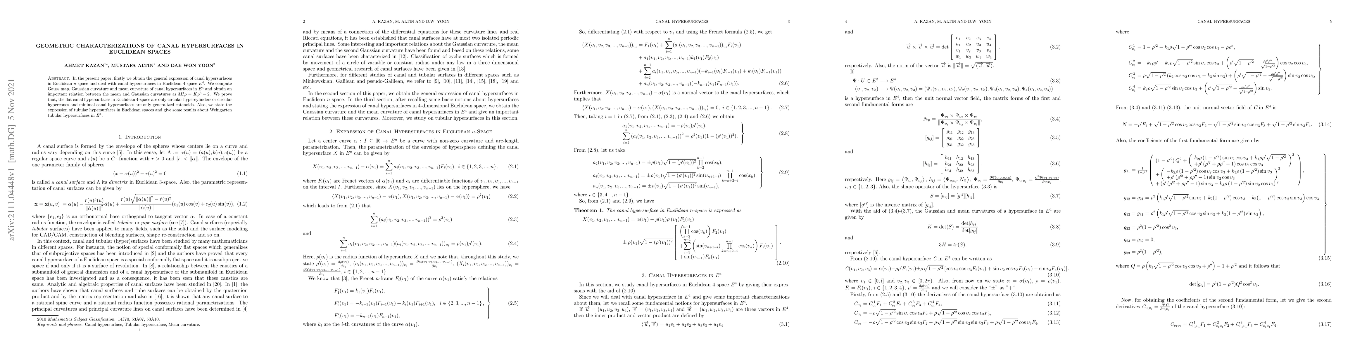 The paper derives the general expression of canal hypersurfaces in Euclidean n-space, focusing on Euclidean 4-space E4. It computes the Gauss map, Gaussian curvature, and mean curvature for these hypersurfaces, establishing a crucial relationship between mean and Gaussian curvatures as 3Hρ = Kρ^3 - 2.