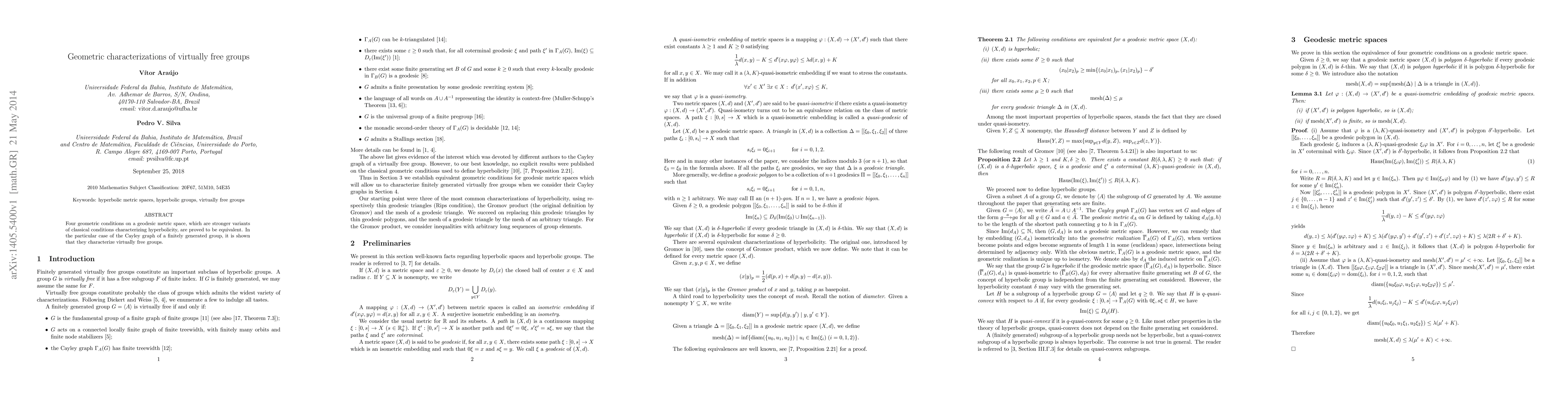 The paper establishes that four geometric conditions on geodesic metric spaces, analogous to hyperbolicity, are equivalent and specifically characterize virtually free groups when applied to the Cayley graph of a finitely generated group.