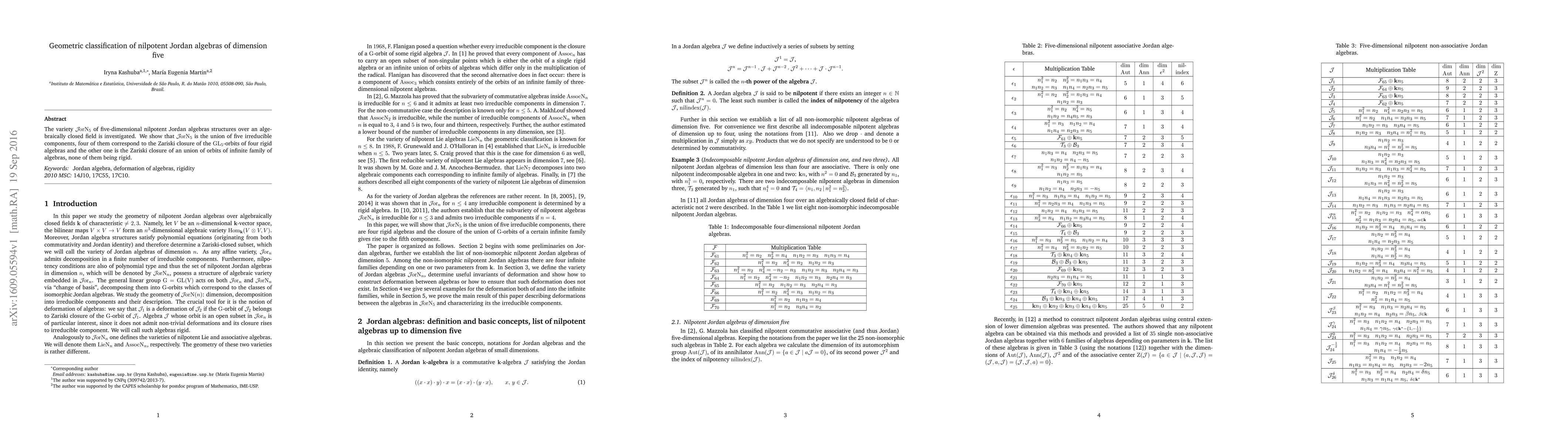 This paper classifies five-dimensional nilpotent Jordan algebras, demonstrating that their variety $JorN_{5}$ consists of five irreducible components: four corresponding to the closures of $GL_5$-orbits of rigid algebras, and one encompassing an infinite family of non-rigid algebras.
