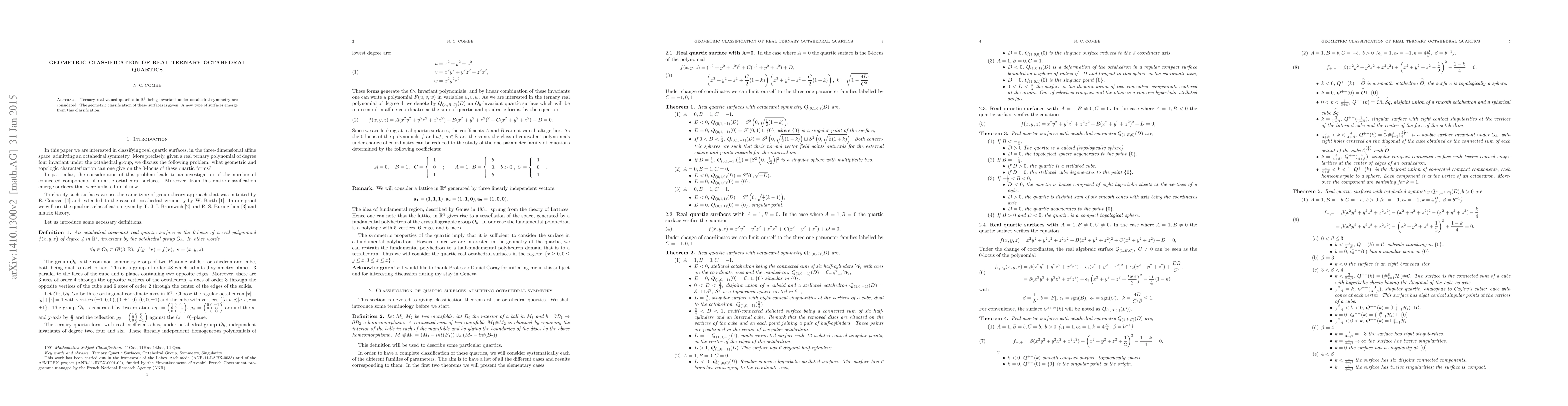 Ternary real-valued quartics in $\mathbb{R}^3$ being invariant under octahedral symmetry are considered. The geometric classification of these surfaces is given. A new type of surfaces emerge from this classification.
