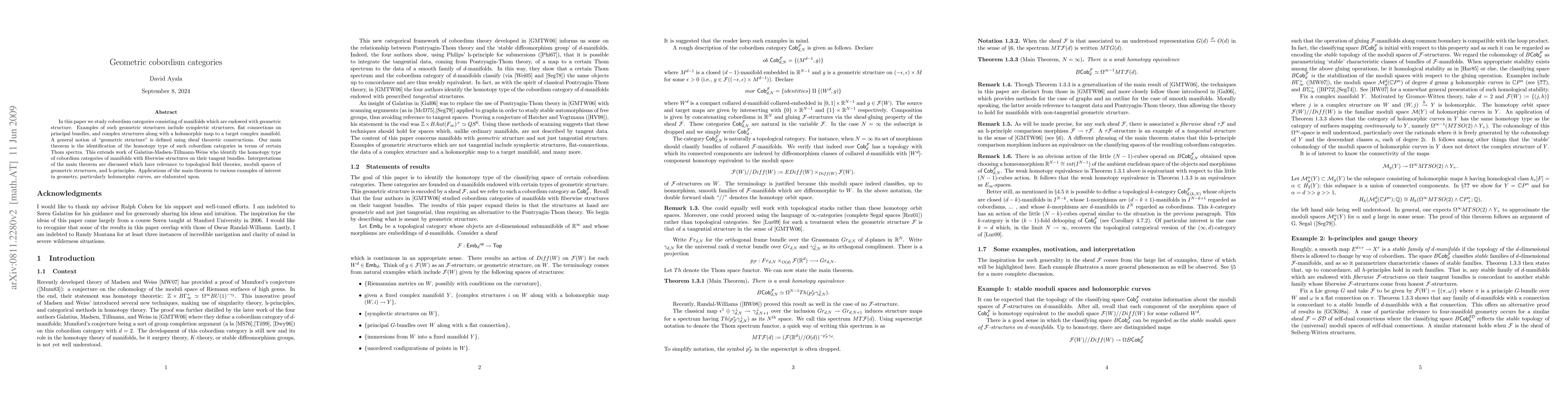 This paper explores cobordism categories of manifolds with geometric structures, defining these via sheaf theory and identifying their homotopy types using Thom spectra. The main theorem extends previous work and has implications for topological field theories, moduli spaces, and h-principles, with applications to holomorphic curves.