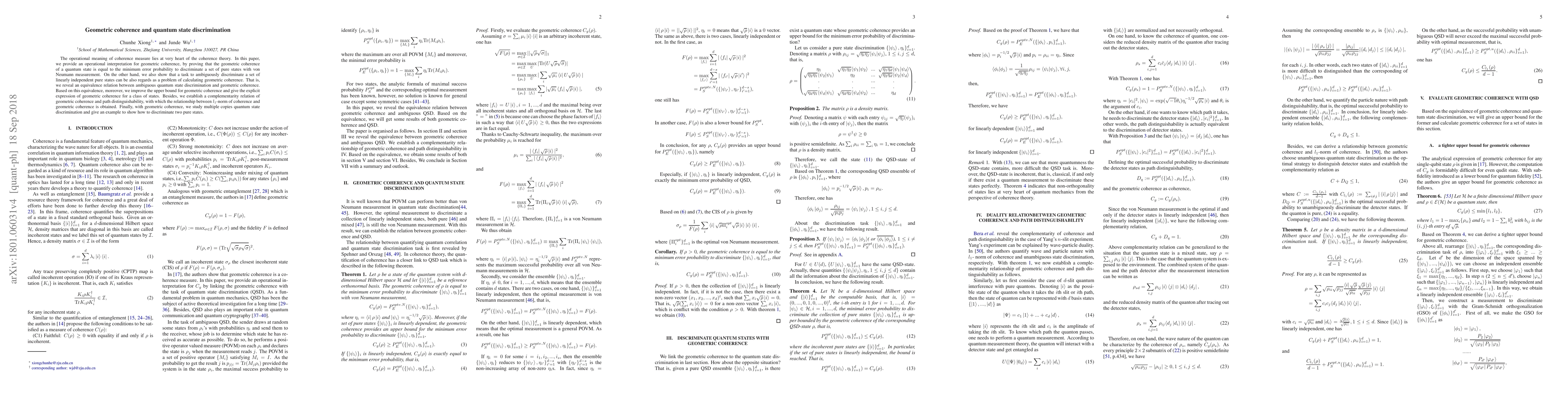 This paper establishes an operational interpretation of geometric coherence in quantum state discrimination, proving its equivalence to the minimum error probability in distinguishing pure states. It also improves the upper bound for geometric coherence and explores its complementarity with path distinguishability, providing insights into multiple copies quantum state discrimination.