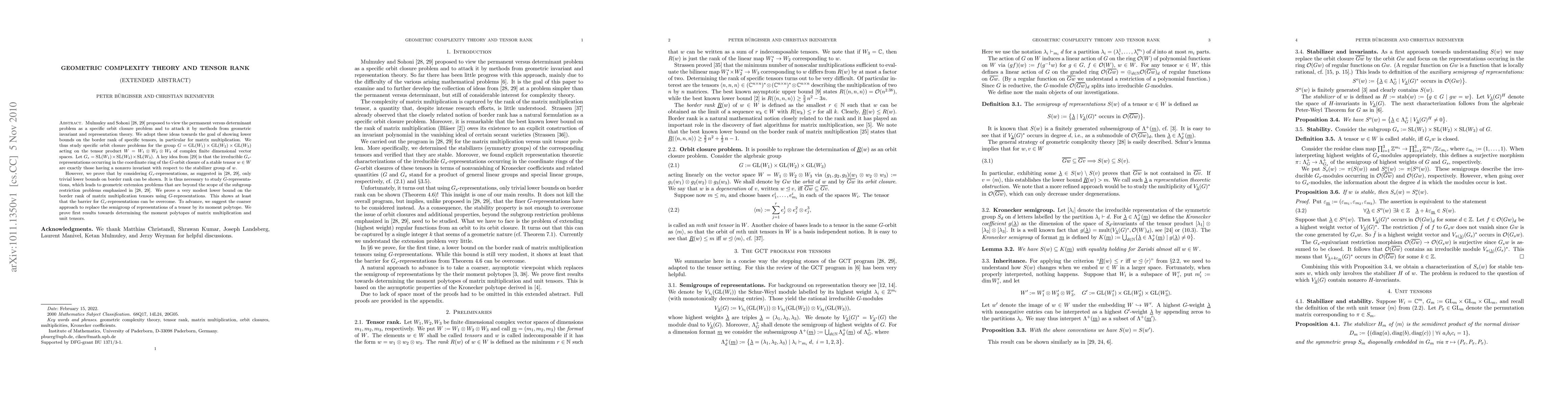 This research paper explores the connection between geometric complexity theory and tensor rank, showing a modest lower bound on the border rank of matrix multiplication tensors using G-representations, while suggesting a coarser approach to overcome the barrier for Gs-representations.