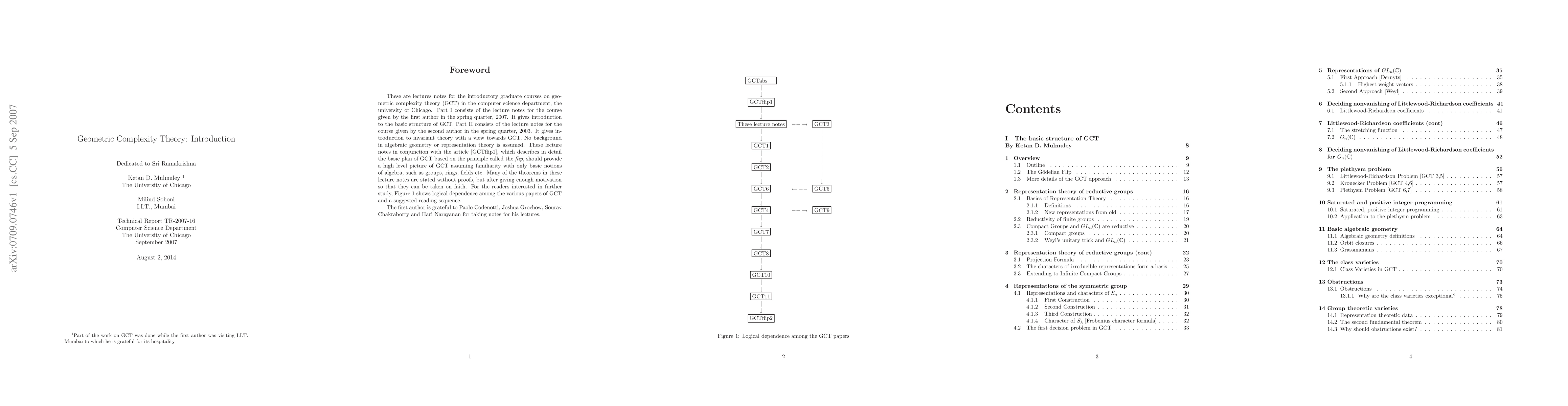 These are lectures notes for the introductory graduate courses on geometric complexity theory (GCT) in the computer science department, the university of Chicago. Part I consists of the lecture notes for the course given by the first author in the spring quarter, 2007. It gives introduction to the basic structure of GCT. Part II consists of the lecture notes for the course given by the second author in the spring quarter, 2003. It gives introduction to invariant theory with a view towards GCT. No background in algebraic geometry or representation theory is assumed. These lecture notes in conjunction with the article \cite{GCTflip1}, which describes in detail the basic plan of GCT based on the principle called the flip, should provide a high level picture of GCT assuming familiarity with only basic notions of algebra, such as groups, rings, fields etc.