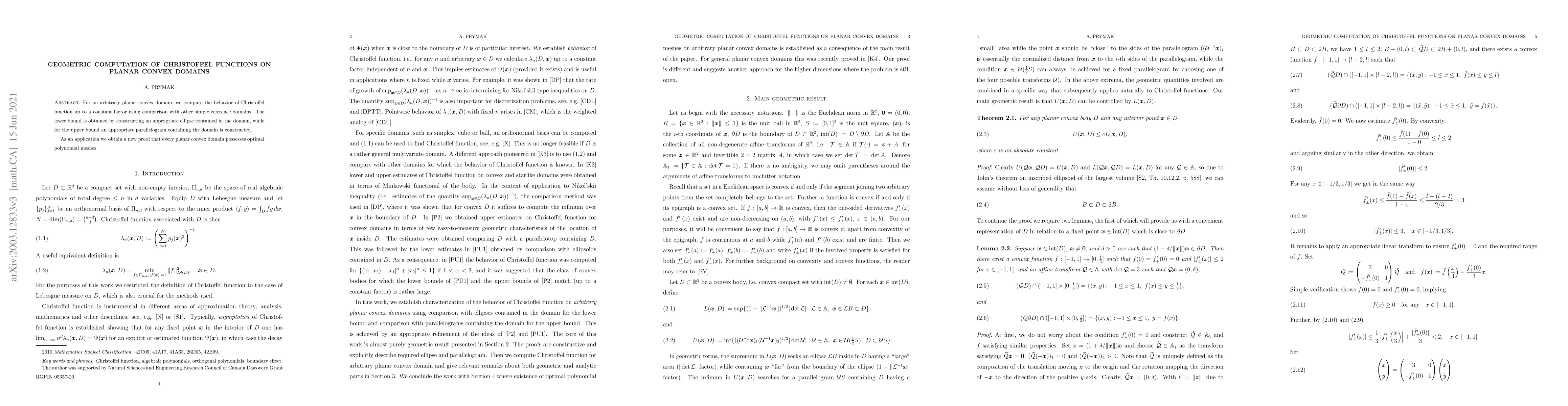 This paper computes the Christoffel function for arbitrary planar convex domains by comparing it to simpler reference domains, establishing bounds using ellipses and parallelepipeds. It also provides a new proof for the existence of optimal polynomial meshes in such domains.