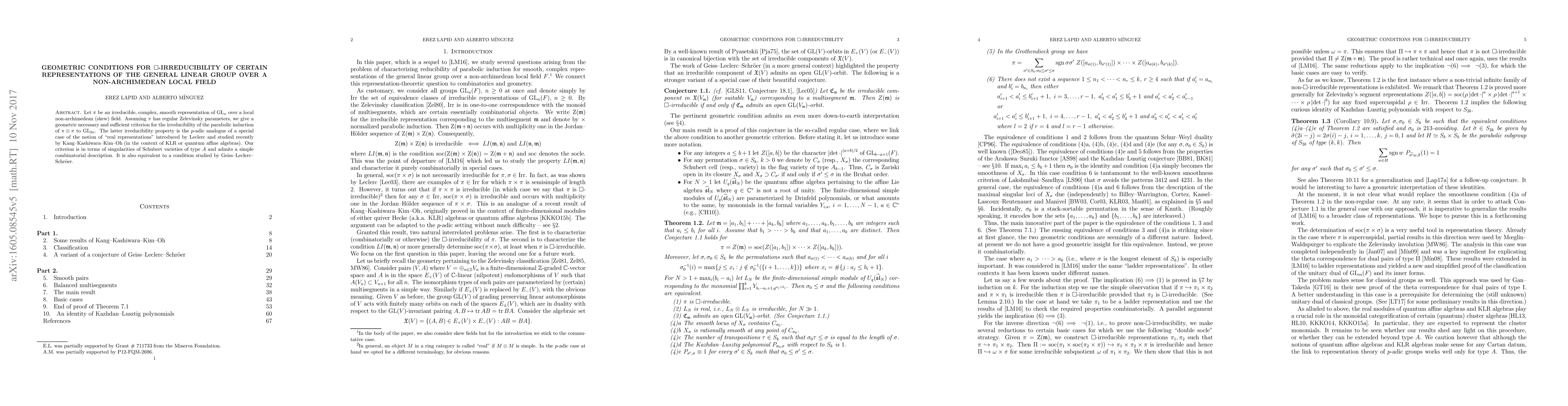 Let $\pi$ be an irreducible, complex, smooth representation of $GL_n$ over a local non-archimedean (skew) field. Assuming $\pi$ has regular Zelevinsky parameters, we give a geometric necessary and sufficient criterion for the irreducibility of the parabolic induction of $\pi\otimes\pi$ to $GL_{2n}$. The latter irreducibility property is the $p$-adic analogue of a special case of the notion of "real representations" introduced by Leclerc and studied recently by Kang-Kashiwara-Kim-Oh (in the context of KLR or quantum affine algebras). Our criterion is in terms of singularities of Schubert varieties of type $A$ and admits a simple combinatorial description. It is also equivalent to a condition studied by Geiss-Leclerc-Schr\"oer.