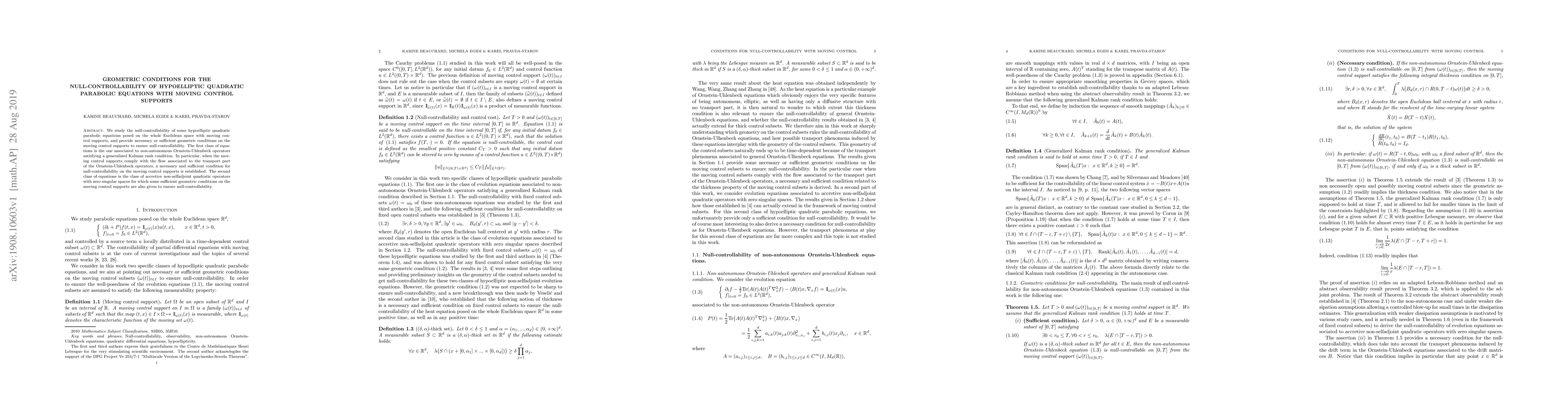 This paper investigates the null-controllability of hypoelliptic quadratic parabolic equations with moving control supports, providing necessary or sufficient geometric conditions for controllability. It establishes a necessary and sufficient condition for the first class of equations linked to non-autonomous Ornstein-Uhlenbeck operators, and sufficient conditions for the second class of accretive non-selfadjoint quadratic operators.