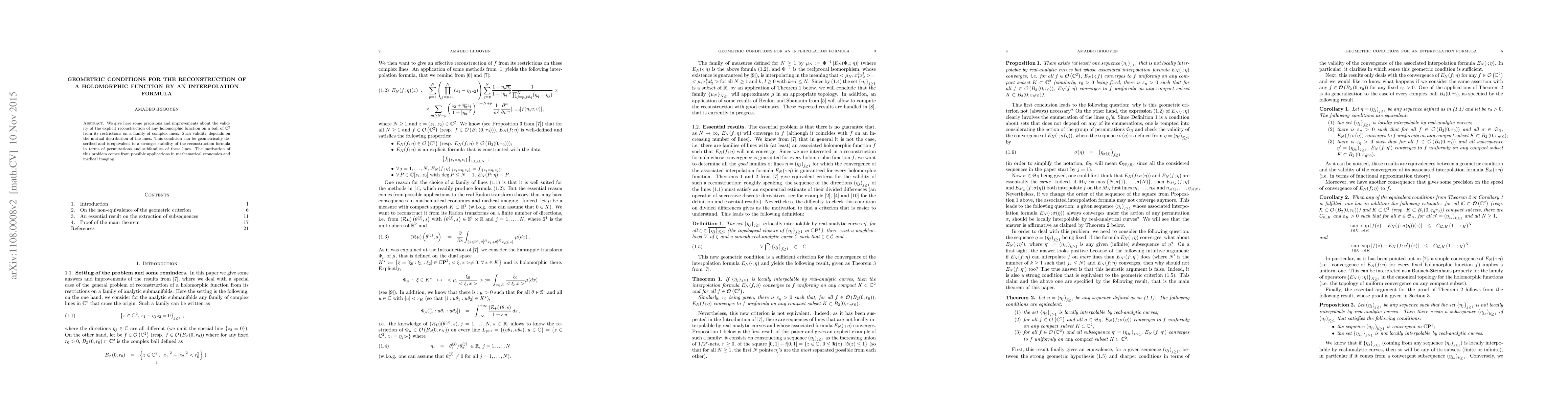 We give here some precisions and improvements about the validity of the explicit reconstruction of any holomorphic function on a ball of $\mathbb{C}^2$ from its restrictions on a family of complex lines. Such validity depends on the mutual distribution of the lines. This condition can be geometrically described and is equivalent to a stronger stability of the reconstruction formula in terms of permutations and subfamilies of these lines. The motivation of this problem comes from possible applications in mathematical economics and medical imaging.