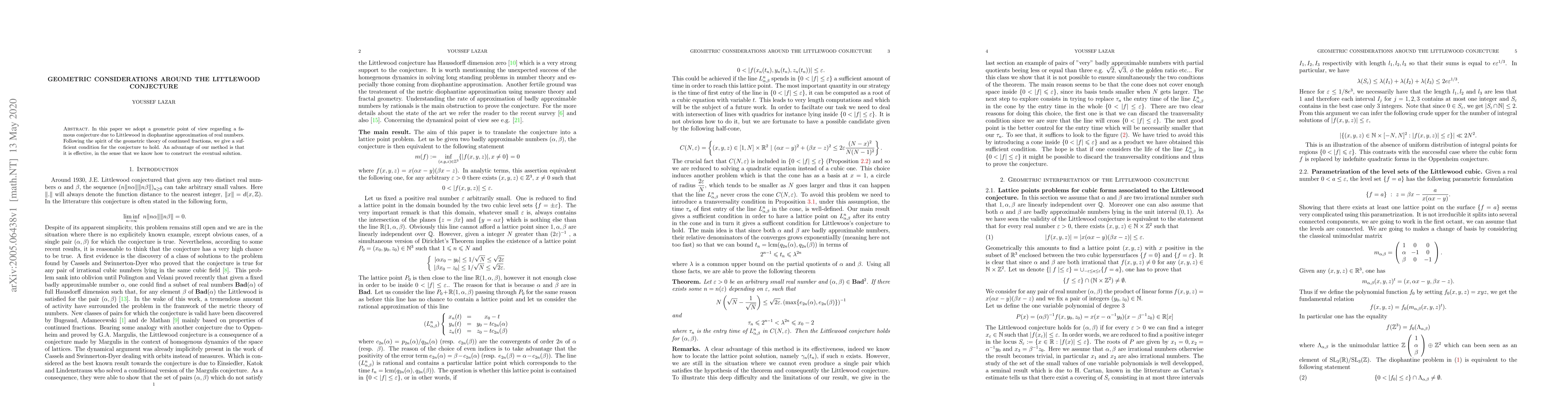 In this paper we adopt a geometric point of view regarding a famous conjecture due to Littlewood in diophantine approximation of real numbers. Following the spirit of the geometric theory of continued fractions, we give a sufficient condition for the conjecture to hold. An advantage of our method is that it is effective, in the sense that we know how to construct the eventual solution.