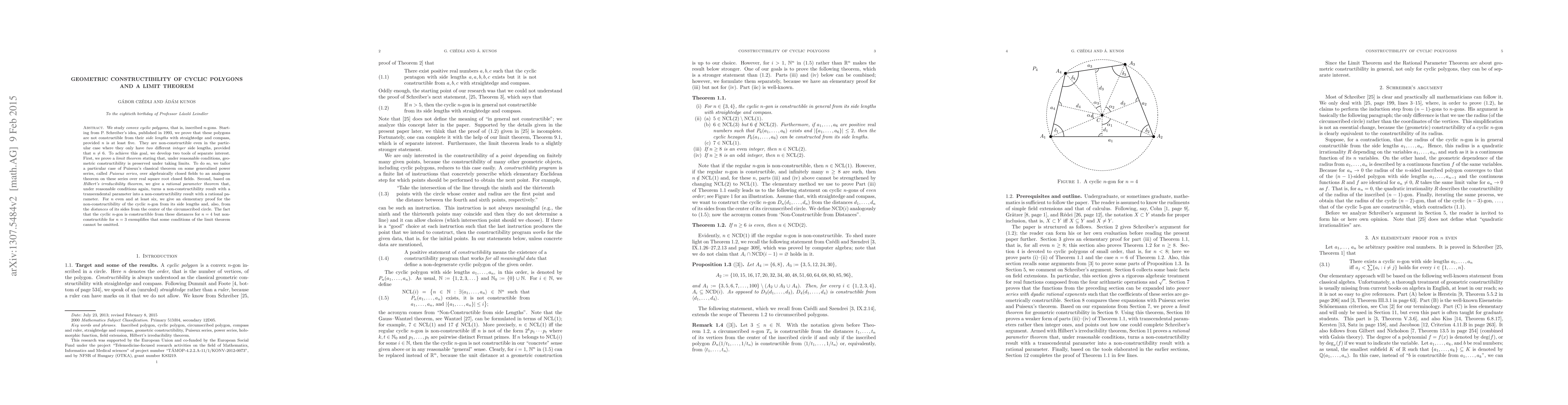 This paper proves that convex cyclic polygons with five or more sides are not constructible using only straightedge and compass, even when they have only two different integer side lengths. The authors develop two key tools: a limit theorem preserving constructibility under certain conditions and a rational parameter theorem based on Hilbert's irreducibility theorem.
