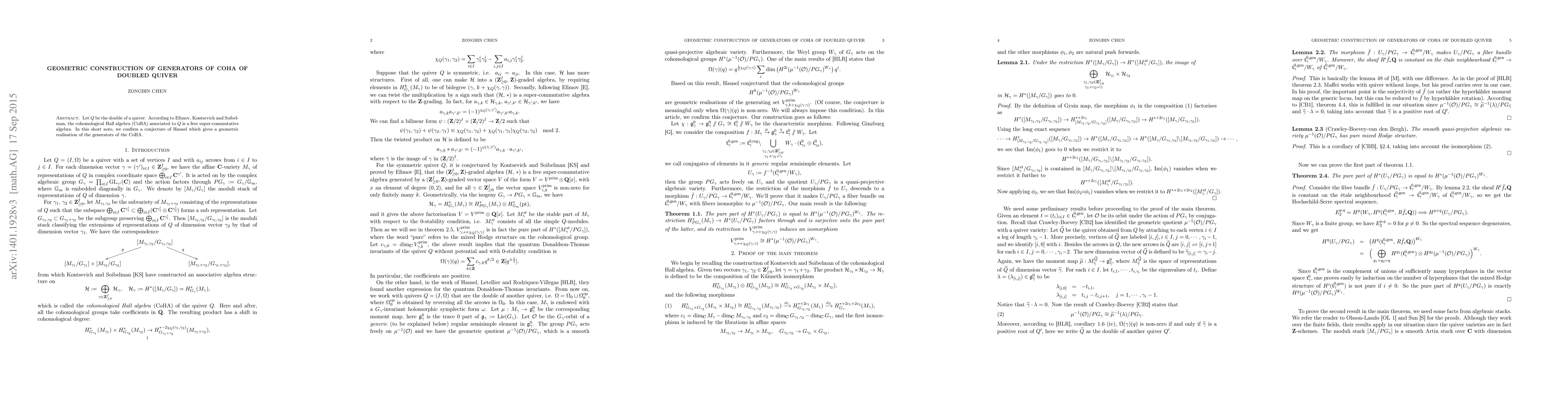 Summary: This paper confirms Hausel's conjecture by providing a geometric construction that realizes the generators of the cohomological Hall algebra (CoHA) associated with the doubled quiver $Q$, which is shown to be a free super-commutative algebra as per Efimov, Kontsevich, and Soibelman.