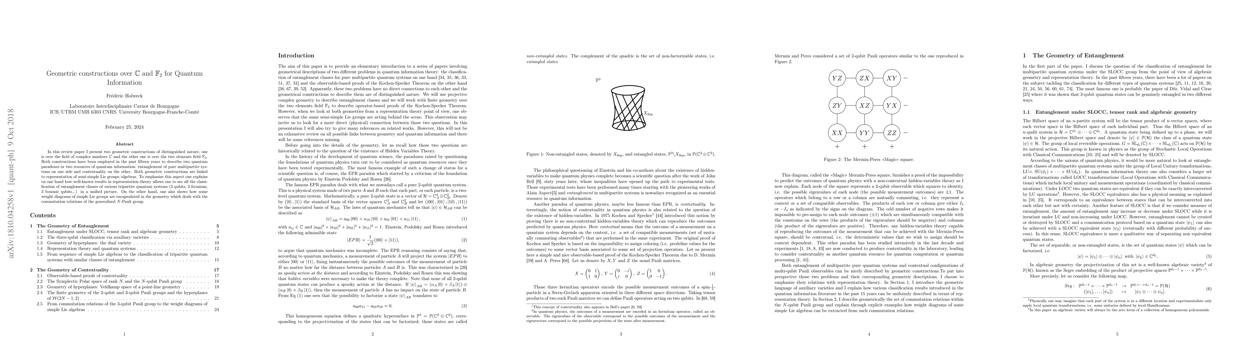 In this review paper I present two geometric constructions of distinguished nature, one is over the field of complex numbers $\mathbb{C}$ and the other one is over the two elements field $\mathbb{F}_2$. Both constructions have been employed in the past fifteen years to describe two quantum paradoxes or two resources of quantum information: entanglement of pure multipartite systems on one side and contextuality on the other. Both geometric constructions are linked to representation of semi-simple Lie groups/algebras. To emphasize this aspect one explains on one hand how well-known results in representation theory allows one to see all the classification of entanglement classes of various tripartite quantum systems ($3$ qubits, $3$ fermions, $3$ bosonic qubits...) in a unified picture. On the other hand, one also shows how some weight diagrams of simple Lie groups are encapsulated in the geometry which deals with the commutation relations of the generalized $N$-Pauli group.