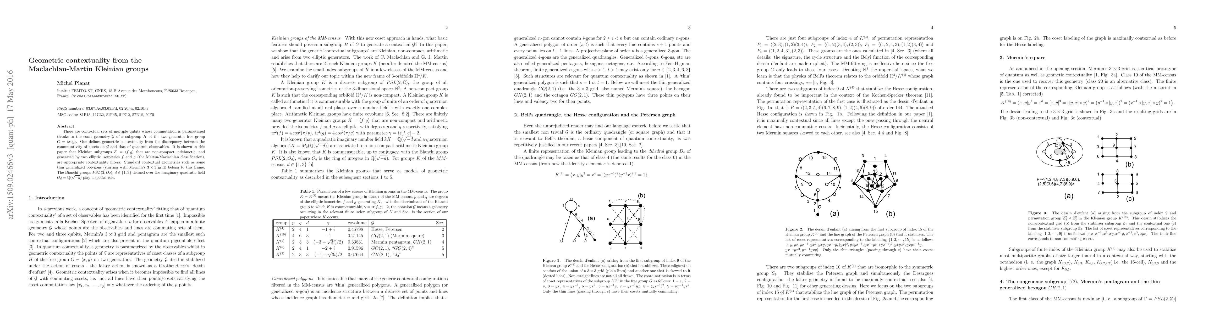 There are contextual sets of multiple qubits whose commutation is parametrized thanks to the coset geometry $\mathcal{G}$ of a subgroup $H$ of the two-generator free group $G=\left\langle x,y\right\rangle$. One defines geometric contextuality from the discrepancy between the commutativity of cosets on $\mathcal{G}$ and that of quantum observables.It is shown in this paper that Kleinian subgroups $K=\left\langle f,g\right\rangle$ that are non-compact, arithmetic, and generated by two elliptic isometries $f$ and $g$ (the Martin-Maclachlan classification), are appropriate contextuality filters. Standard contextual geometries such as some thin generalized polygons (starting with Mermin's $3 \times 3$ grid) belong to this frame. The Bianchi groups $PSL(2,O\_d)$, $d \in \{1,3\}$ defined over the imaginary quadratic field $O\_d=\mathbb{Q}(\sqrt{-d})$ play a special role.