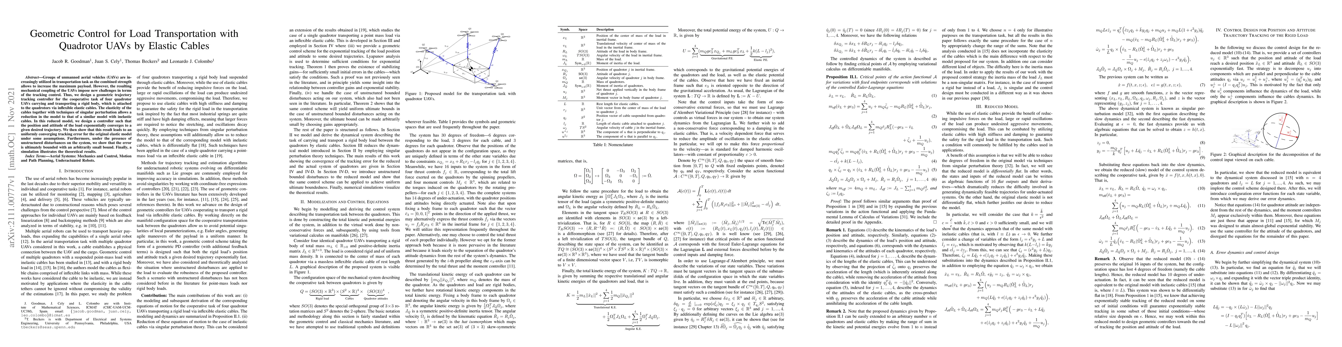 Groups of unmanned aerial vehicles (UAVs) are increasingly utilized in transportation task as the combined strength allows to increase the maximum payload. However, the resulting mechanical coupling of the UAVs impose new challenges in terms of the tracking control. Thus, we design a geometric trajectory tracking controller for the cooperative task of four quadrotor UAVs carrying and transporting a rigid body, which is attached to the quadrotors via inflexible elastic cables. The elasticity of the cables together with techniques of singular perturbation allows a reduction in the model to that of a similar model with inelastic cables. In this reduced model, we design a controller such that the position and attitude of the load exponentially converges to a given desired trajectory. We then show that this result leads to an uniformly converging tracking error for the original elastic model under some assumptions. Furthermore, under the presence of unstructured disturbances on the system, we show that the error is ultimately bounded with an arbitrarily small bound. Finally, a simulation illustrates the theoretical results.