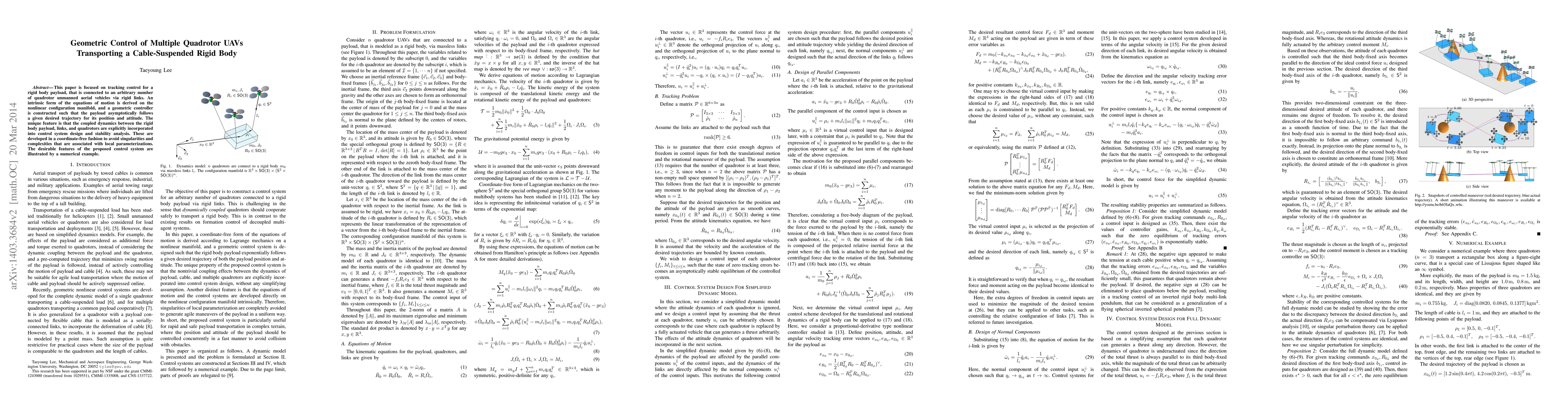 This paper develops control systems for multiple quadrotor UAVs to transport a cable-suspended rigid body, ensuring the payload follows a desired trajectory. The control systems are designed in a coordinate-free manner to avoid singularities and local parameterization complexities.