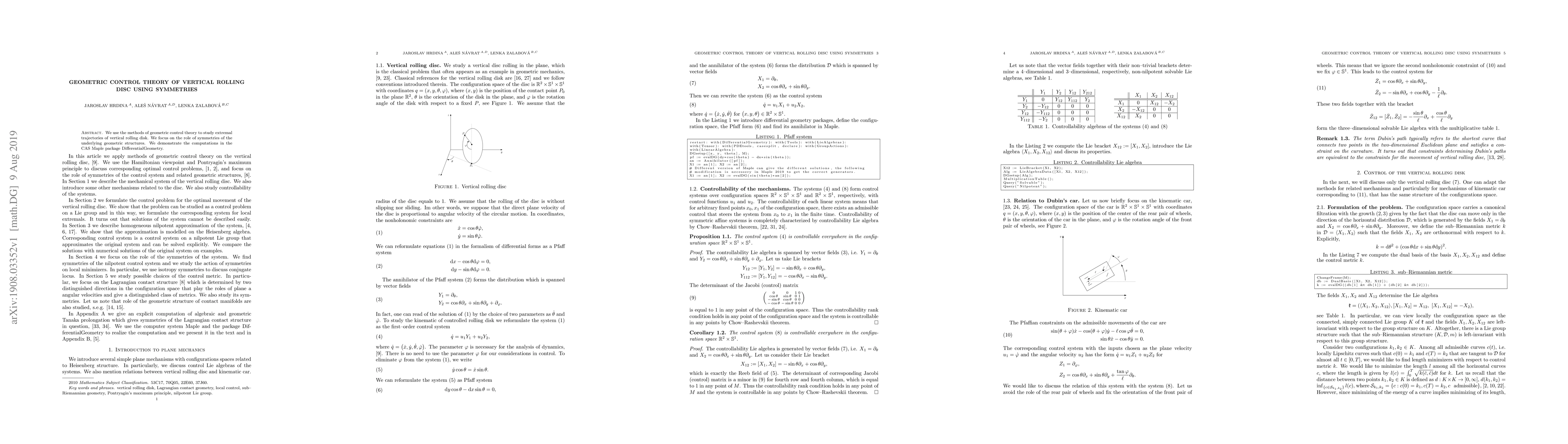This paper applies geometric control theory to analyze extremal trajectories of a vertically rolling disc, emphasizing the significance of symmetries in the system's geometry. The study utilizes the DifferentialGeometry package in Maple for computational demonstrations.