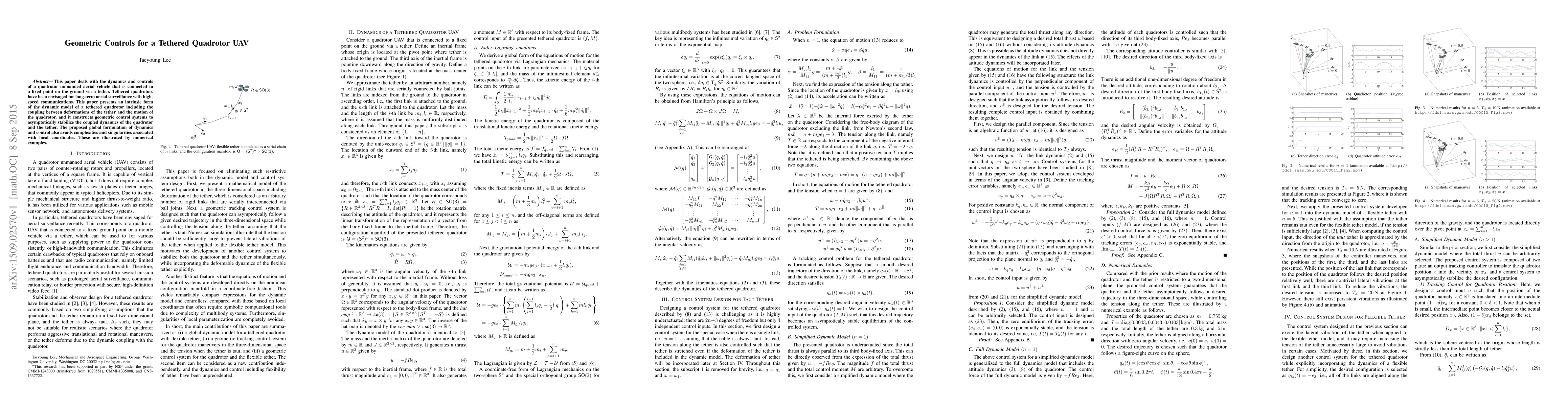 This paper develops a dynamic model for a tethered quadrotor UAV, incorporating tether deformations, and proposes geometric control systems to stabilize the coupled dynamics. The global formulation avoids singularities and is demonstrated through numerical examples.