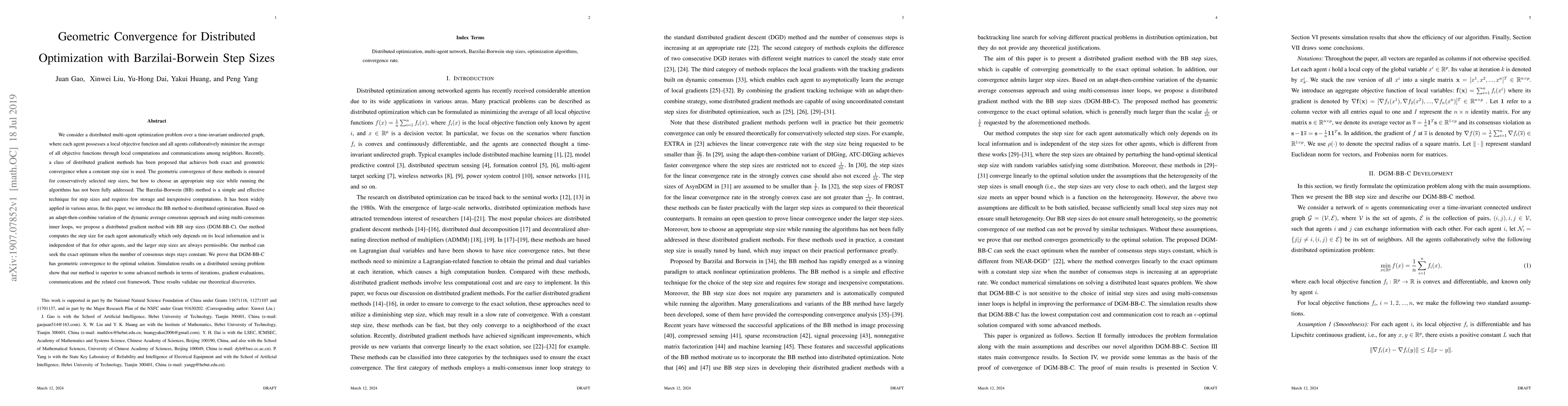 This paper proposes a distributed gradient method (DGM-BB-C) for multi-agent optimization using Barzilai-Borwein step sizes, which automatically computes step sizes based on local information. The method achieves geometric convergence and outperforms advanced methods in terms of iterations, gradient evaluations, and communication costs.