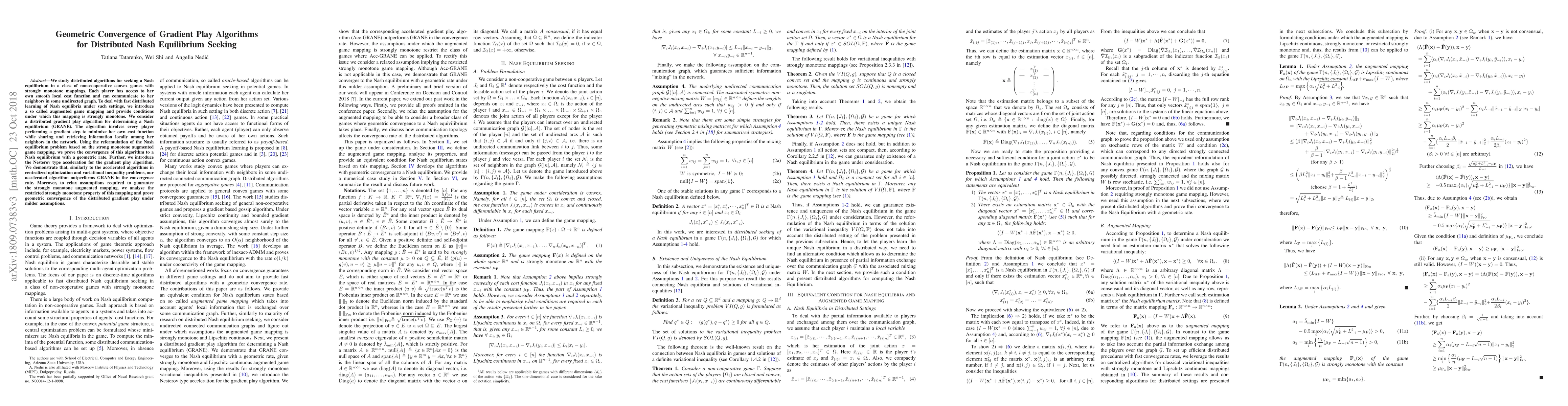 This paper explores distributed algorithms for finding Nash equilibria in convex games, introducing a gradient play algorithm (GRANE) that converges geometrically. It also proposes an accelerated version that improves convergence rates and relaxes the conditions for strong monotonicity of the augmented game mapping.