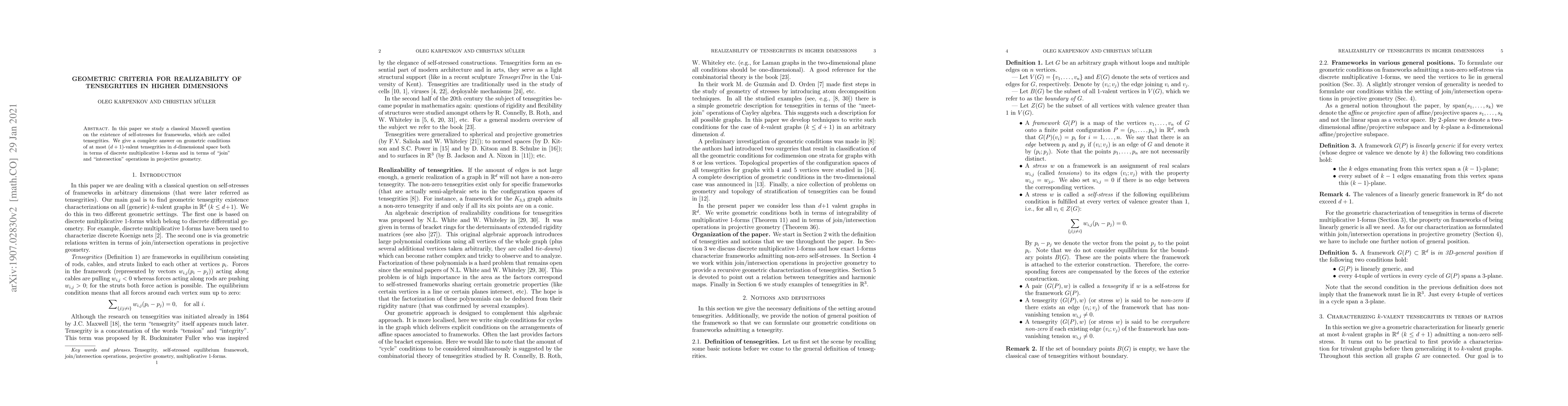 In this paper we study a classical Maxwell question on the existence of self-stresses for frameworks, which are called tensegrities. We give a complete answer on geometric conditions of at most $(d+1)$-valent tensegrities in $\mathbb{R}^d$ both in terms of discrete multiplicative 1-forms and in terms of "meet" and "join" operations in the Grassmann-Cayley algebra.