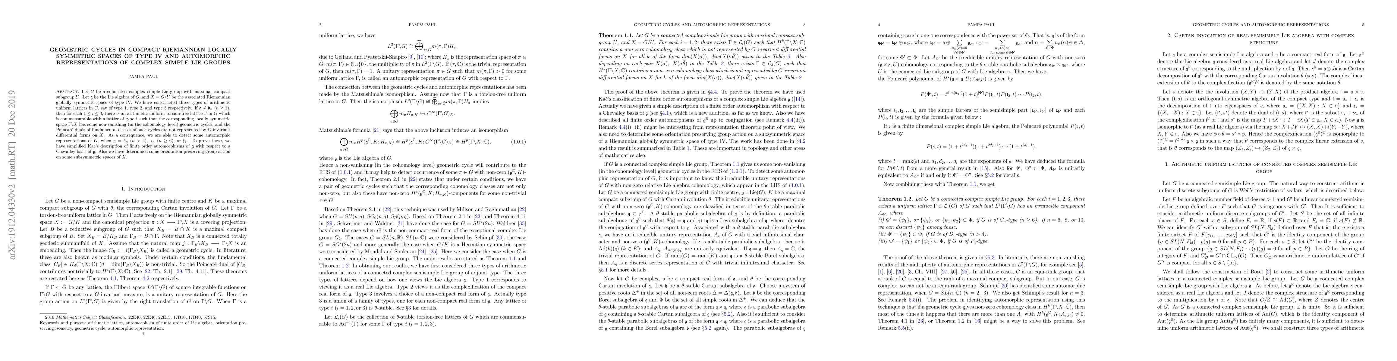 Let G be a connected complex simple Lie group with maximal compact subgroup U. Let g be the Lie algebra of G, and X = G/U be the associated Riemannian globally symmetric space of type IV. We have constructed three types of arithmetic uniform lattices in G, say of type 1, type 2, and type 3 respectively. If g is not equal to b_n, n>0, then for each 04), c_n (n > 5), or f_4. To prove these, we have simplified Kac's description of finite order automorphisms of g with respect to a Chevalley basis of g. Also we have determined some orientation preserving group action on some subsymmetric spaces of X.