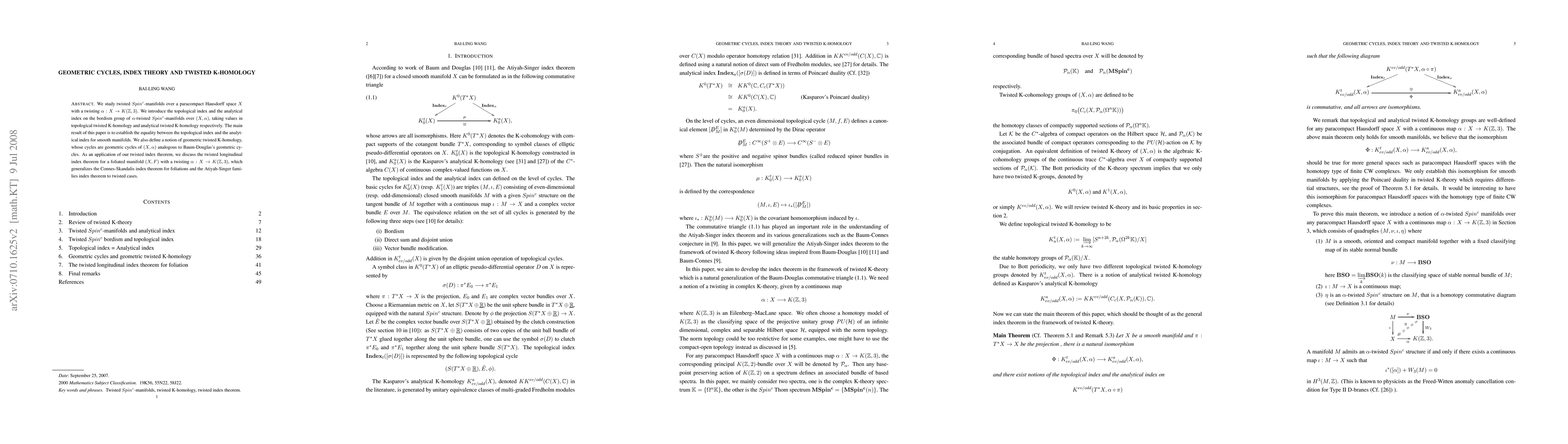 We study twisted $Spin^c$-manifolds over a paracompact Hausdorff space $X$ with a twisting $\alpha: X \to K(\ZZ, 3)$. We introduce the topological index and the analytical index on the bordism group of $\alpha$-twisted $Spin^c$-manifolds over $(X, \alpha)$, taking values in topological twisted K-homology and analytical twisted K-homology respectively. The main result of this paper is to establish the equality between the topological index and the analytical index. We also define a notion of geometric twisted K-homology, whose cycles are geometric cycles of $(X, \a)$ analogous to Baum-Douglas's geometric cycles. As an application of our twisted index theorem, we discuss the twisted longitudinal index theorem for a foliated manifold $(X, F)$ with a twisting $\alpha: X \to K(\ZZ, 3)$, which generalizes the Connes-Skandalis index theorem for foliations and the Atiyah-Singer families index theorem to twisted cases.