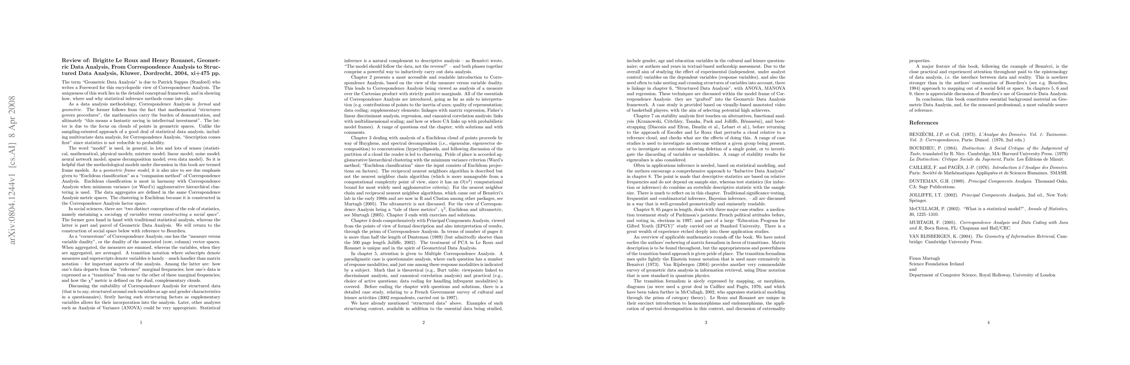 Review of: Brigitte Le Roux and Henry Rouanet, Geometric Data Analysis, From Correspondence Analysis to Structured Data Analysis, Kluwer, Dordrecht, 2004, xi+475 pp.
