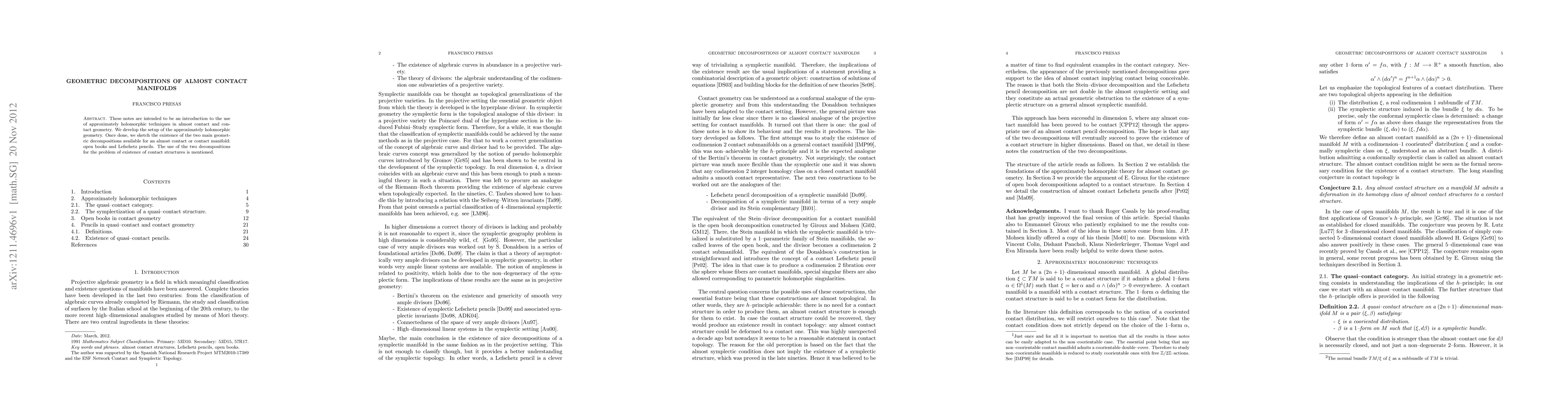 These notes are intended to be an introduction to the use of approximately holomorphic techniques in almost contact and contact geometry. We develop the setup of the approximately holomorphic geometry. Once done, we sketch the existence of the two main geometric decompositions available for an almost contact or contact manifold: open books and Lefschetz pencils. The use of the two decompositions for the problem of existence of contact structures is mentioned.