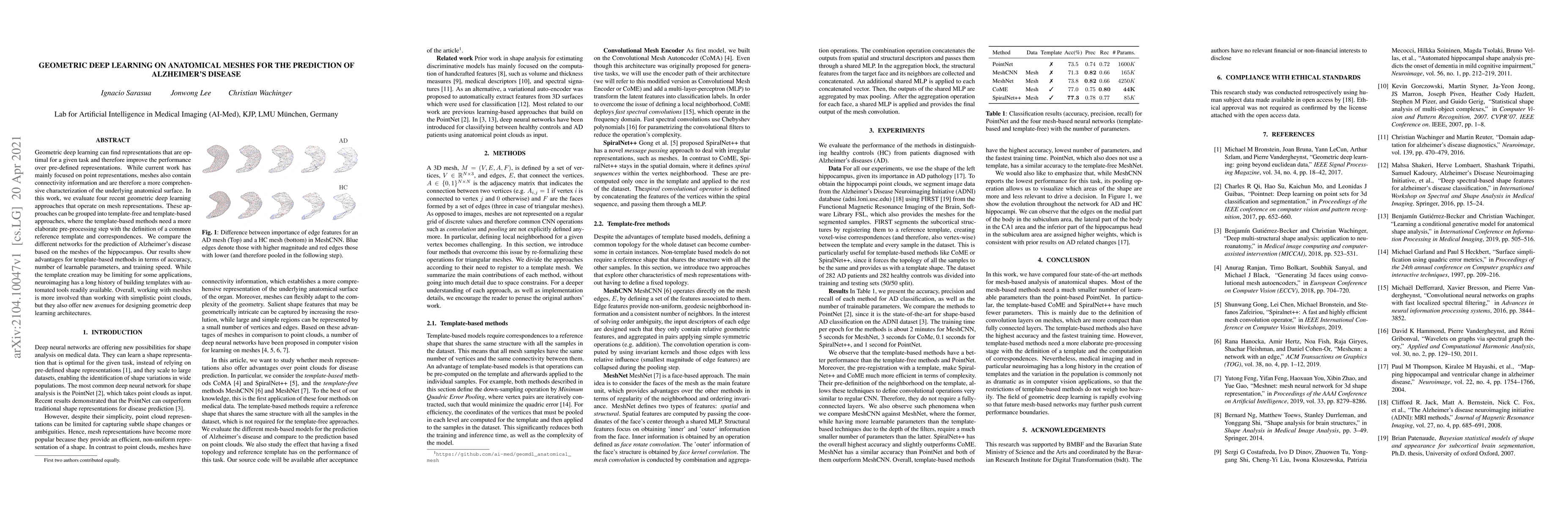 This research evaluates four geometric deep learning methods on anatomical meshes for predicting Alzheimer's disease, comparing template-free and template-based approaches. Template-based methods showed higher accuracy, fewer parameters, and faster training, though template creation can be limiting. Meshes provide richer anatomical information compared to point clouds.