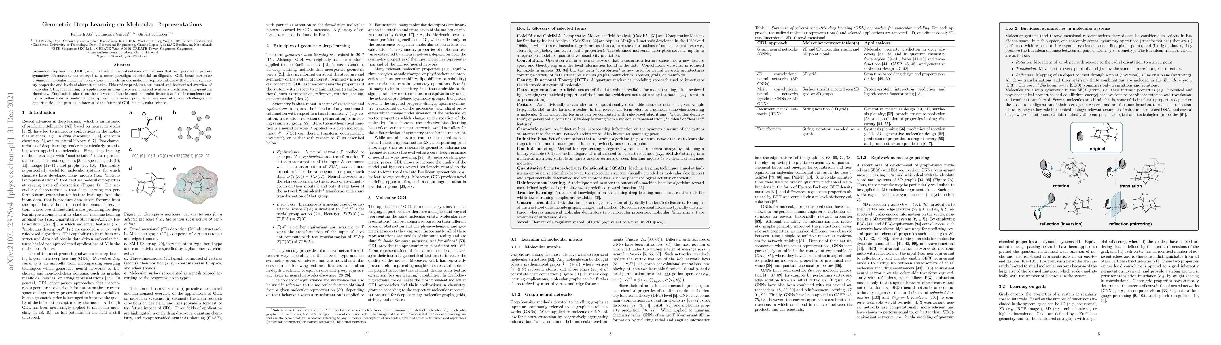 Geometric deep learning (GDL), which is based on neural network architectures that incorporate and process symmetry information, has emerged as a recent paradigm in artificial intelligence. GDL bears particular promise in molecular modeling applications, in which various molecular representations with different symmetry properties and levels of abstraction exist. This review provides a structured and harmonized overview of molecular GDL, highlighting its applications in drug discovery, chemical synthesis prediction, and quantum chemistry. Emphasis is placed on the relevance of the learned molecular features and their complementarity to well-established molecular descriptors. This review provides an overview of current challenges and opportunities, and presents a forecast of the future of GDL for molecular sciences.