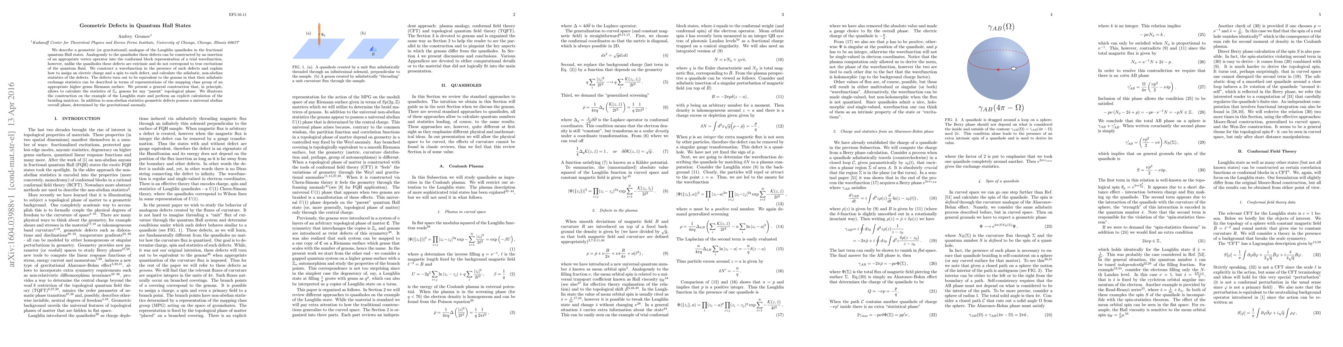 Researchers discover geometric defects in quantum Hall states that mimic genons, with non-abelian exchange statistics and a universal abelian overall phase.