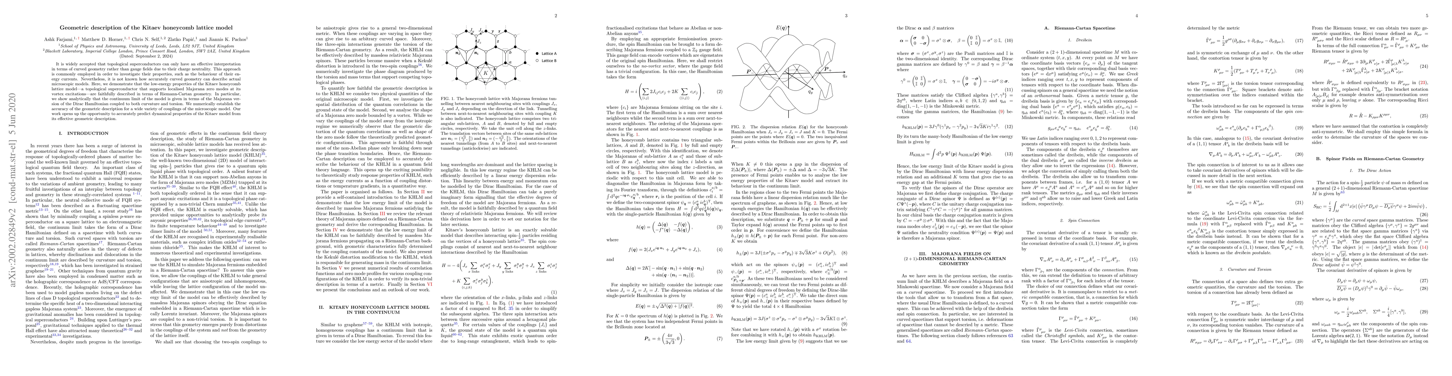 This paper demonstrates that the low-energy properties of the Kitaev honeycomb lattice model, a topological superconductor, are accurately described by Riemann-Cartan geometry, which couples the Majorana version of the Dirac Hamiltonian to curvature and torsion. The study provides both analytical and numerical validation, suggesting a precise geometric interpretation of the model's dynamics.