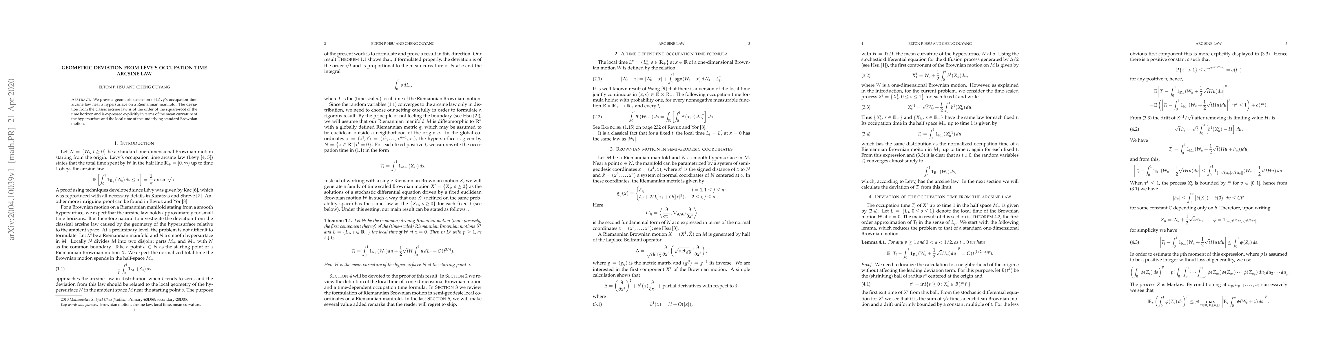 This paper extends L\'evy's occupation time arcsine law to Riemannian manifolds, demonstrating a geometric deviation that scales with the square-root of the time horizon, and explicitly relates this deviation to the mean curvature of the hypersurface and the local time of Brownian motion.