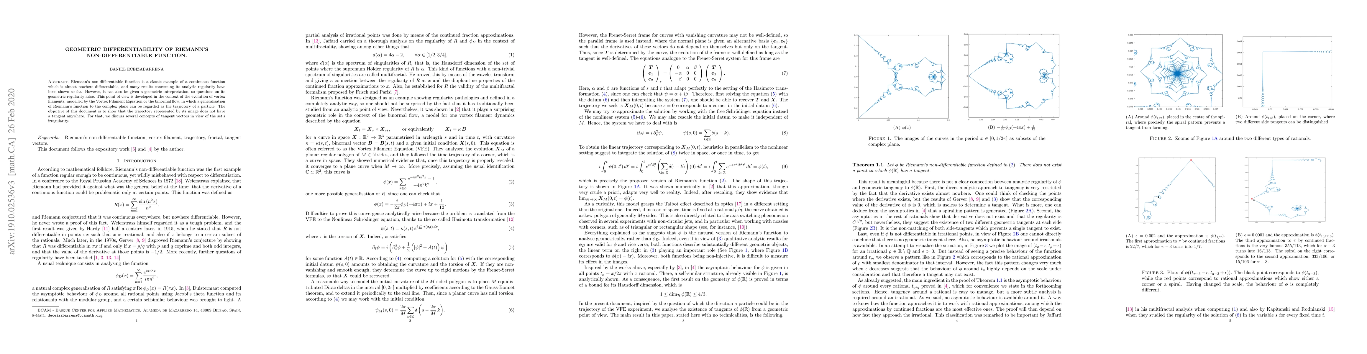 This paper explores the geometric differentiability of Riemann's non-differentiable function, demonstrating that its trajectory lacks tangents anywhere. It uses concepts of tangent vectors to analyze the function's irregularity in the context of vortex filament evolution.