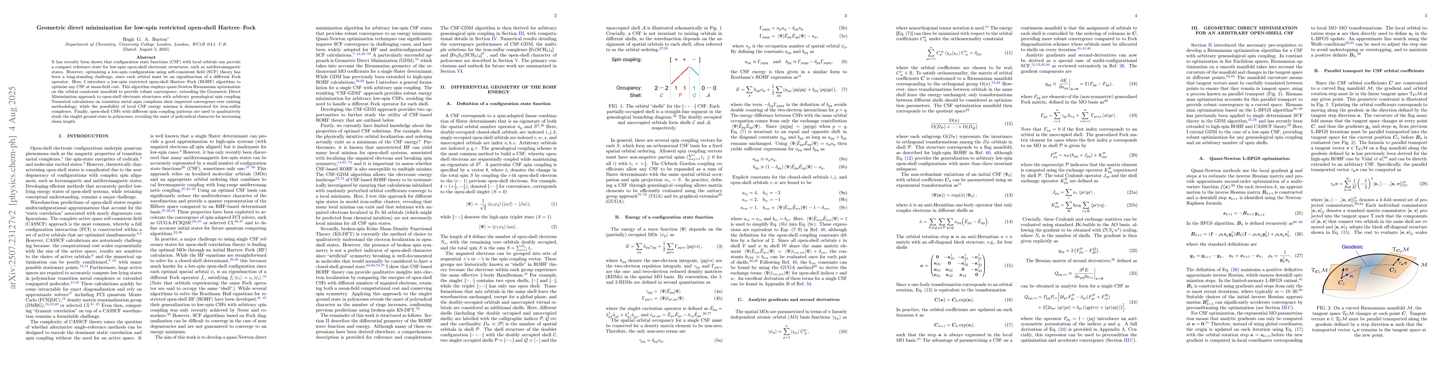 It has recently been shown that configuration state functions (CSF) with local orbitals can provide a compact reference state for low-spin open-shell electronic structures, such as antiferromagnetic states. However, optimizing a low-spin configuration using self-consistent field (SCF) theory has been a long-standing challenge, since each orbital must be an eigenfunction of a different Fock operator. Here, I introduce a low-spin restricted open-shell Hartree-Fock (ROHF) algorithm to optimize any CSF at mean-field cost. This algorithm employs quasi-Newton Riemannian optimization on the orbital constraint manifold to provide robust convergence, extending the Geometric Direct Minimization approach to open-shell electronic structures with arbitrary genealogical spin coupling. Numerical calculations on transition metal aquo complexes show improved convergence over existing methodology, and reveal the potential for many local CSF energy minima in iron-sulfur complexes. Finally, open-shell CSFs with different spin coupling patterns are used to qualitatively study the singlet ground state in polyacenes, revealing the onset of polyradical character for increasing chain length.