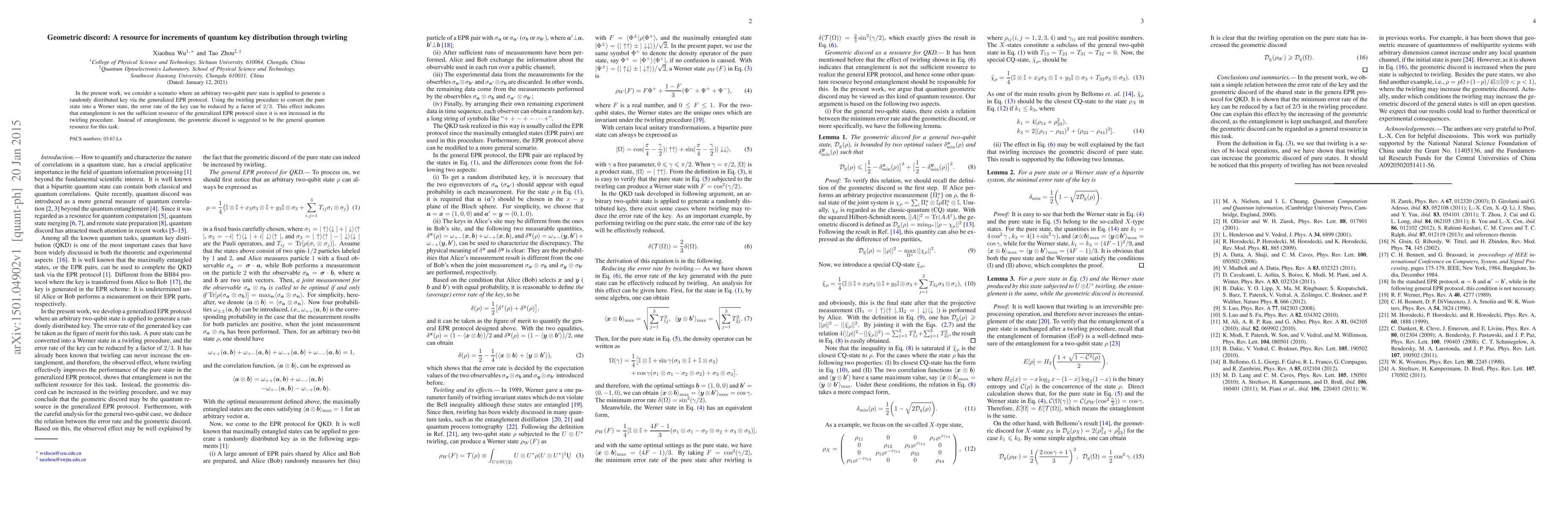 Summary: This paper explores how twirling a pure two-qubit state into a Werner state reduces the error rate in quantum key distribution, suggesting that geometric discord, rather than entanglement, is the key resource for the generalized EPR protocol. The reduction in error rate by a factor of $2/3$ highlights the importance of geometric discord in quantum key distribution.