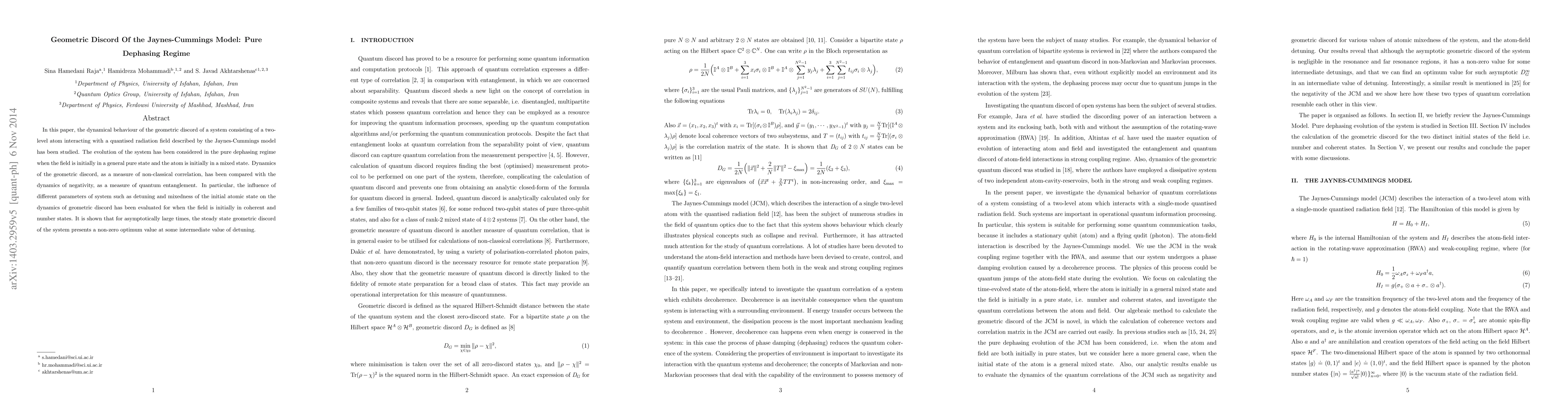 In this paper, the dynamical behaviour of the geometric discord of a system consisting of a two-level atom interacting with a quantised radiation field described by the Jaynes-Cummings model has been studied. The evolution of the system has been considered in the pure dephasing regime when the field is initially in a general pure state and the atom is initially in a mixed state. Dynamics of the geometric discord, as a measure of non-classical correlation, has been compared with the dynamics of negativity, as a measure of quantum entanglement. In particular, the influence of different parameters of system such as detuning and mixedness of the initial atomic state on the dynamics of geometric discord has been evaluated for when the field is initially in coherent and number states. It is shown that for asymptotically large times, the steady state geometric discord of the system presents a non-zero optimum value at some intermediate value of detuning.