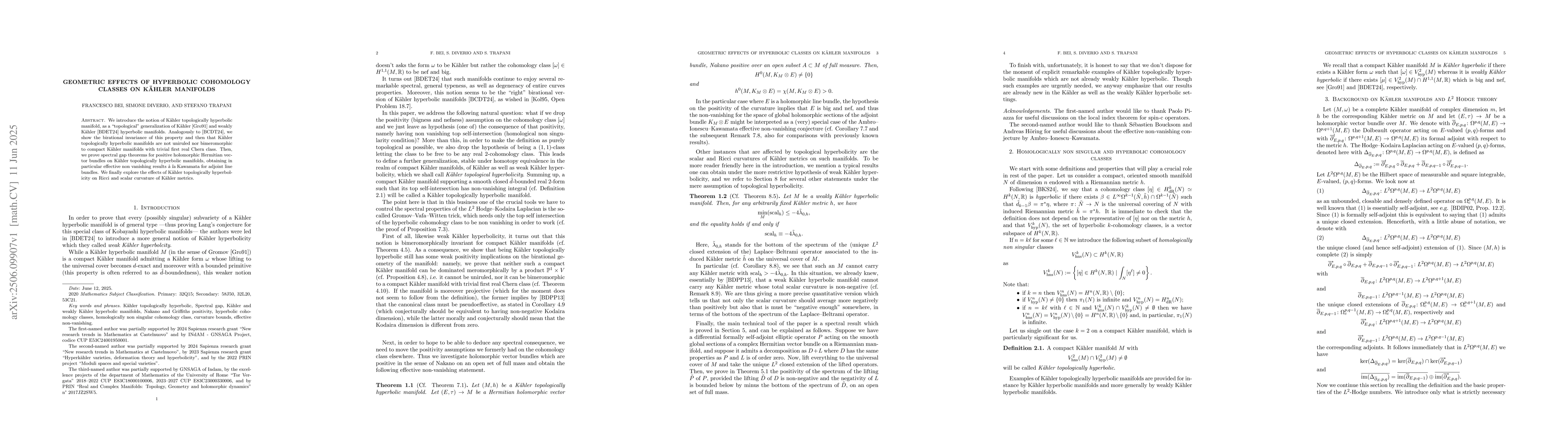 We introduce the notion of K\"ahler topologically hyperbolic manifold, as a"topological" generalization of K\"ahler [Gro91] and weakly K\"ahler [BDET24] hyperbolic manifolds. Analogously to [BCDT24], we show the birational invariance of this property and then that K\"ahler topologically hyperbolic manifolds are not uniruled nor bimeromorphic to compact K\"ahler manifolds with trivial first real Chern class. Then, we prove spectral gap theorems for positive holomorphic Hermitian vector bundles on K\"ahler topologically hyperbolic manifolds, obtaining in particular effective non vanishing results \`a la Kawamata for adjoint line bundles. We finally explore the effects of K\"ahler topologically hyperbolicity on Ricci and scalar curvature of K\"ahler metrics.