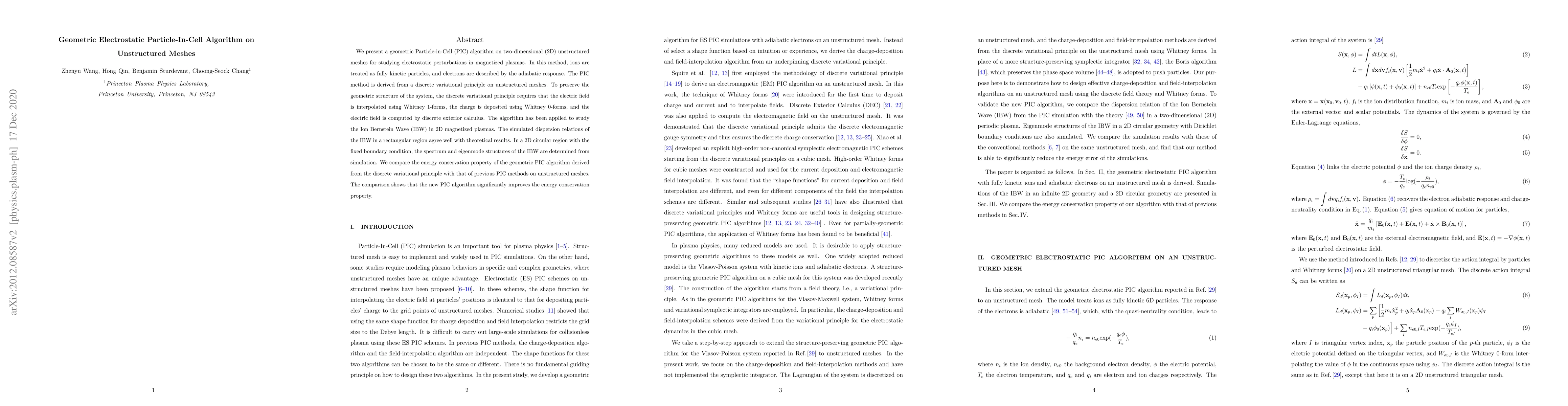 This paper introduces a geometric Particle-in-Cell (PIC) algorithm on 2D unstructured meshes for studying electrostatic perturbations in magnetized plasmas. The method enhances energy conservation by using discrete exterior calculus and Whitney forms, and it successfully simulates Ion Bernstein Wave (IBW) dispersion relations and eigenmode structures.