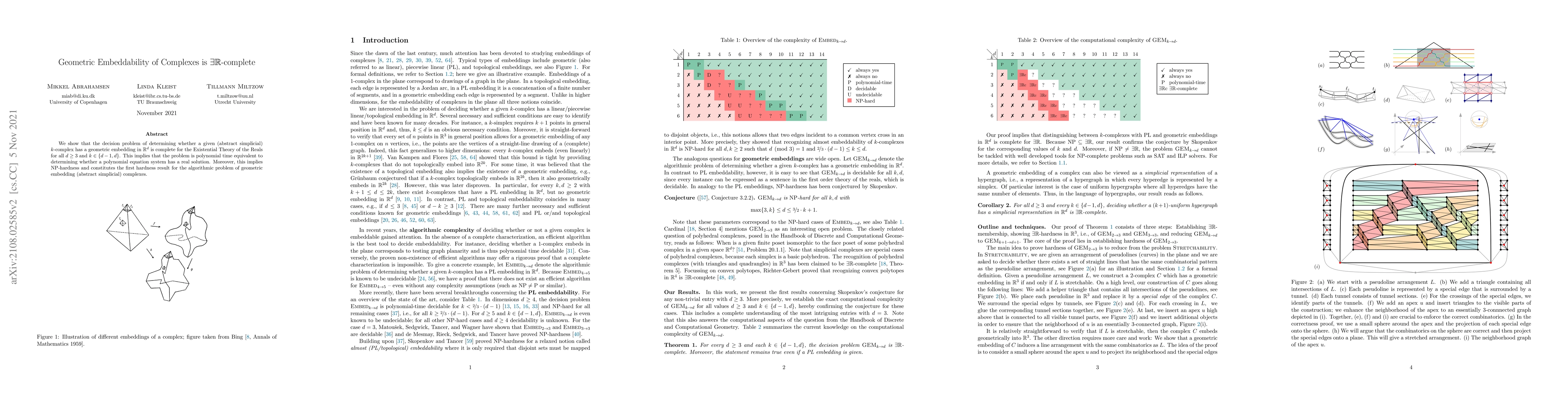 The paper proves that determining if a given abstract simplicial complex can be geometrically embedded in $\mathbb{R}^d$ is $\exists \mathbb{R}$-complete, implying NP-hardness and establishing the first hardness results for the geometric embedding problem. This equivalence also links the problem to solving systems of polynomial equations over the reals.
