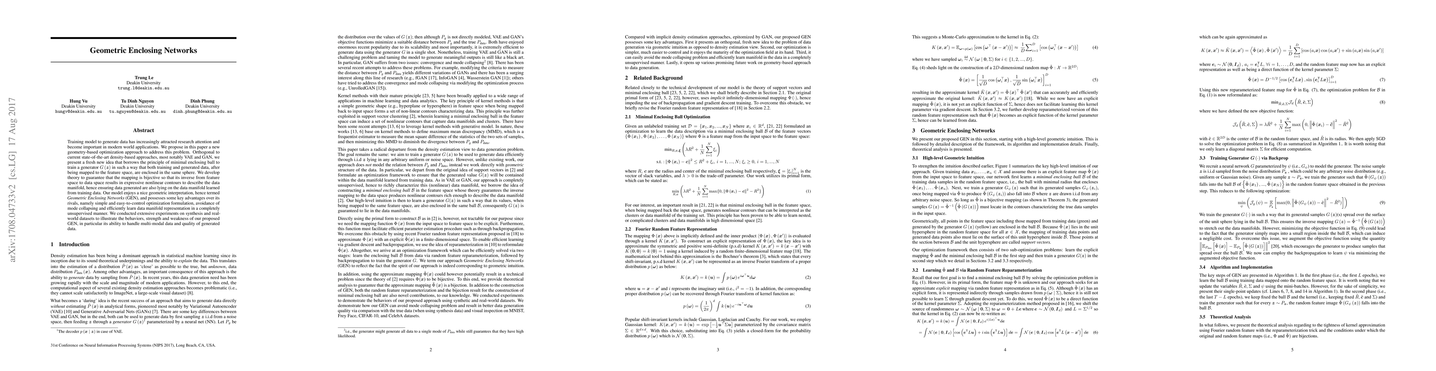 Training model to generate data has increasingly attracted research attention and become important in modern world applications. We propose in this paper a new geometry-based optimization approach to address this problem. Orthogonal to current state-of-the-art density-based approaches, most notably VAE and GAN, we present a fresh new idea that borrows the principle of minimal enclosing ball to train a generator G\left(\bz\right) in such a way that both training and generated data, after being mapped to the feature space, are enclosed in the same sphere. We develop theory to guarantee that the mapping is bijective so that its inverse from feature space to data space results in expressive nonlinear contours to describe the data manifold, hence ensuring data generated are also lying on the data manifold learned from training data. Our model enjoys a nice geometric interpretation, hence termed Geometric Enclosing Networks (GEN), and possesses some key advantages over its rivals, namely simple and easy-to-control optimization formulation, avoidance of mode collapsing and efficiently learn data manifold representation in a completely unsupervised manner. We conducted extensive experiments on synthesis and real-world datasets to illustrate the behaviors, strength and weakness of our proposed GEN, in particular its ability to handle multi-modal data and quality of generated data.