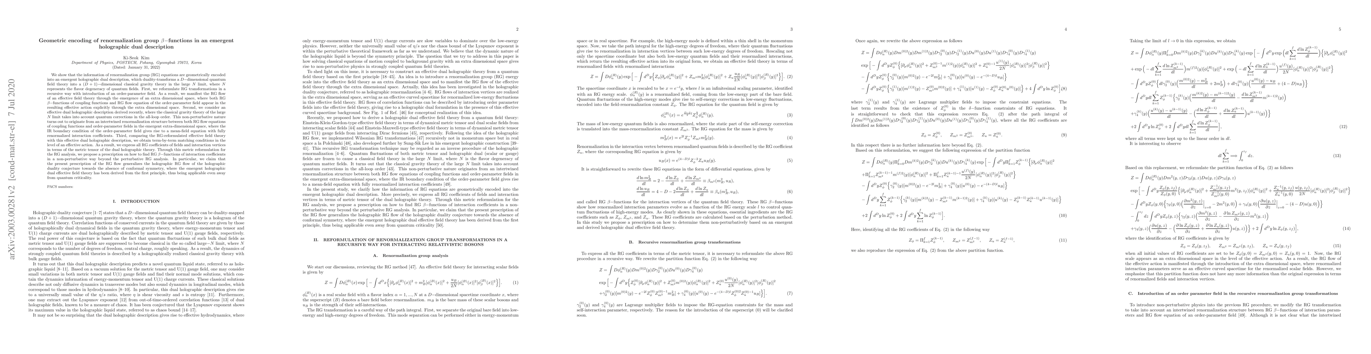 This paper reformulates renormalization group (RG) transformations recursively using an order-parameter field, revealing RG flows in an extra-dimensional space. It also introduces an effective dual holographic description that accounts for quantum corrections in all loops, leading to a non-perturbative renormalization structure. The study finds matching conditions between the reformulated effective field theory and the holographic description, allowing for the expression of RG coefficients in terms of the dual theory's metric tensor, thus providing a non-perturbative method for determining RG β-functions.