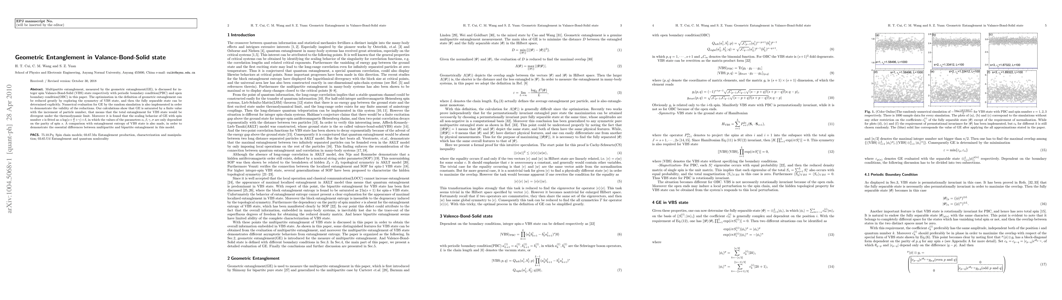 Multipartite entanglement, measured by the geometric entanglement(GE), is discussed for integer spin Valance-Bond-Solid (VBS) state respectively with periodic boundary condition(PBC) and open boundary condition(OBC) in this paper. The optimization in the definition of geometric entanglement can be reduced greatly by exploring the symmetry of VBS state, and then the fully separable state can be determined explicitly. Numerical evaluation for GE by the random simulation is also implemented in order to demonstrate the validity of the reductions. Our calculations show that GE is saturated by a finite value with the increment of particle number, that means that the total entanglement for VBS state would be divergent under the thermodynamic limit. Moreover it is found that the scaling behavior of GE with spin number $s$ is fitted as $\alpha\log (s+\tfrac{\beta}{s}+\gamma)+\delta$, in which the values of the parameters $\alpha, \beta, \gamma, \sigma$ are only dependent on the parity of spin $s$. A comparison with entanglement entropy of VBS state is also made, in order to demonstrate the essential differences between multipartite and bipartite entanglement in this model.