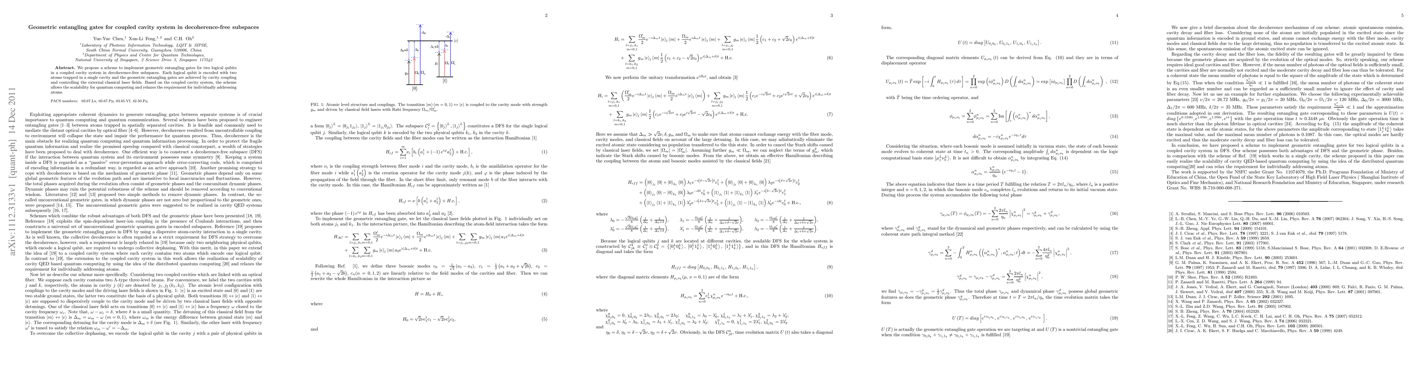 This paper proposes a method for implementing geometric entangling gates in a coupled cavity system using decoherence-free subspaces, where each logical qubit consists of two atoms in a single cavity. The entangling is achieved through cavity coupling and controlled laser fields, facilitating scalability for quantum computing without the need for individual atom addressing.