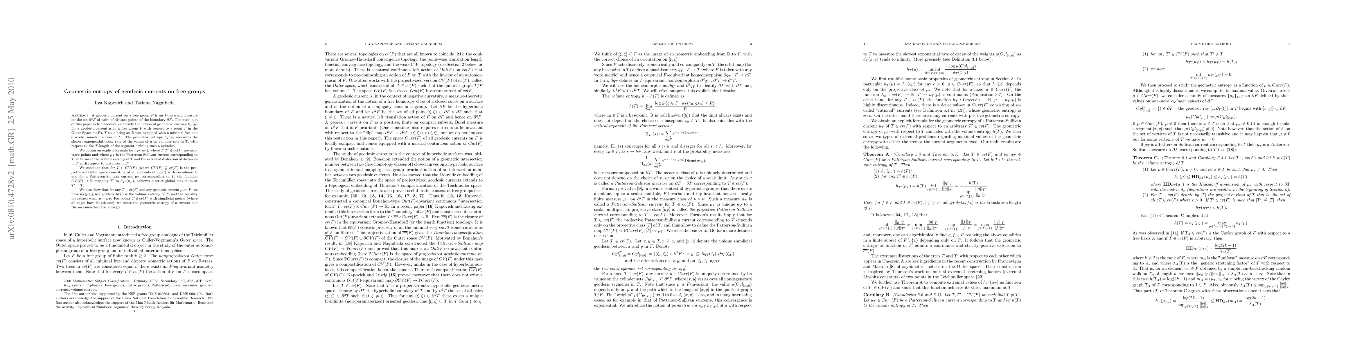 This paper introduces the concept of geometric entropy for geodesic currents on free groups, defined as the slowest rate of exponential decay of measures on bi-infinite cylinders with respect to T-length. It provides an explicit formula for h_{T'}(mu_T) involving volume entropy and extremal distortion, showing a strict global maximum at T'=T. The study also establishes a relationship between geometric entropy and measure-theoretic entropy for simplicial metrics, with applications to Culler-Vogtmann's Outer space and Out(F).