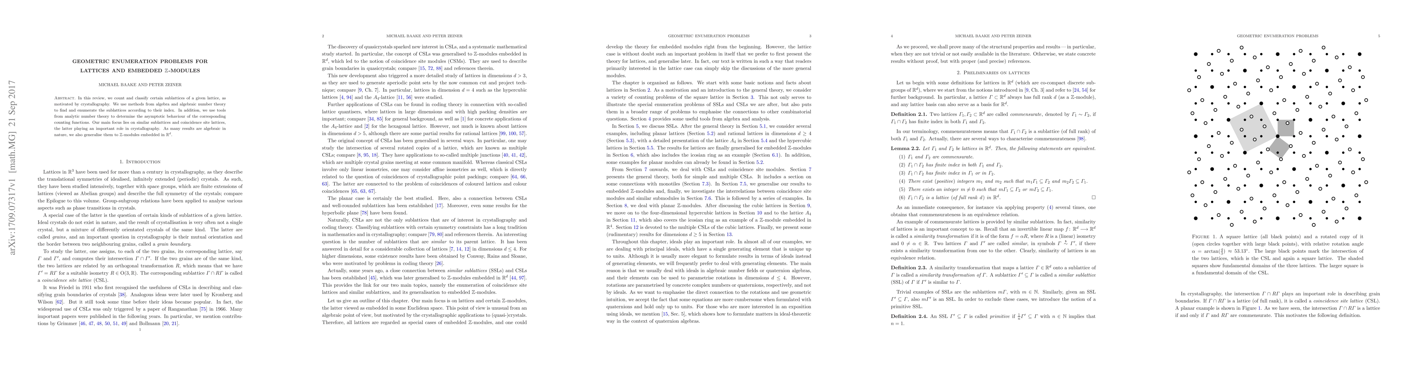 In this review, we count and classify certain sublattices of a given lattice, as motivated by crystallography. We use methods from algebra and algebraic number theory to find and enumerate the sublattices according to their index. In addition, we use tools from analytic number theory to determine the asymptotic behaviour of the corresponding counting functions. Our main focus lies on similar sublattices and coincidence site lattices, the latter playing an important role in crystallography. As many results are algebraic in nature, we also generalise them to $\mathbb{Z}$-modules embedded in $\mathbb{R}^d$.